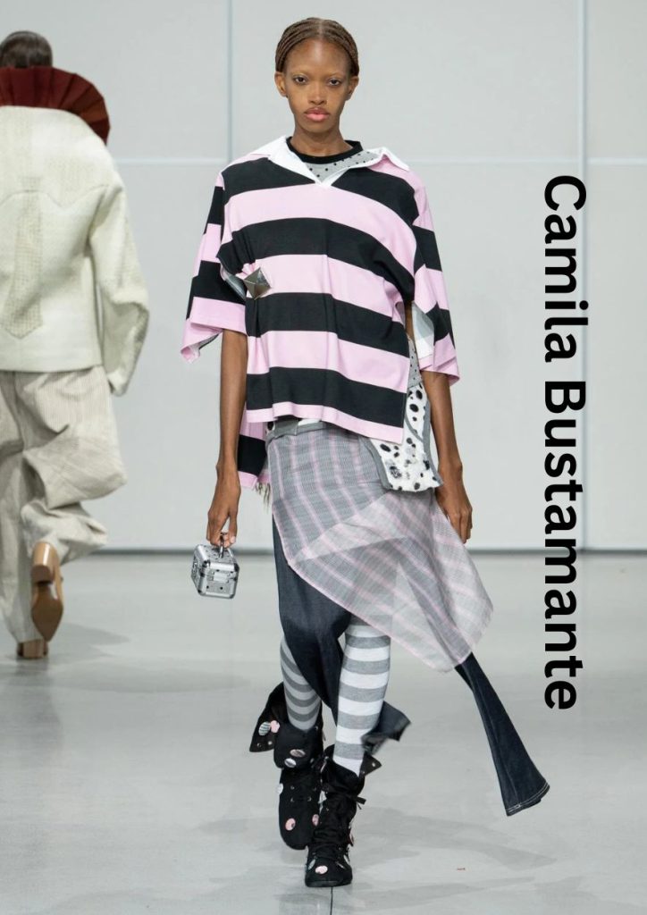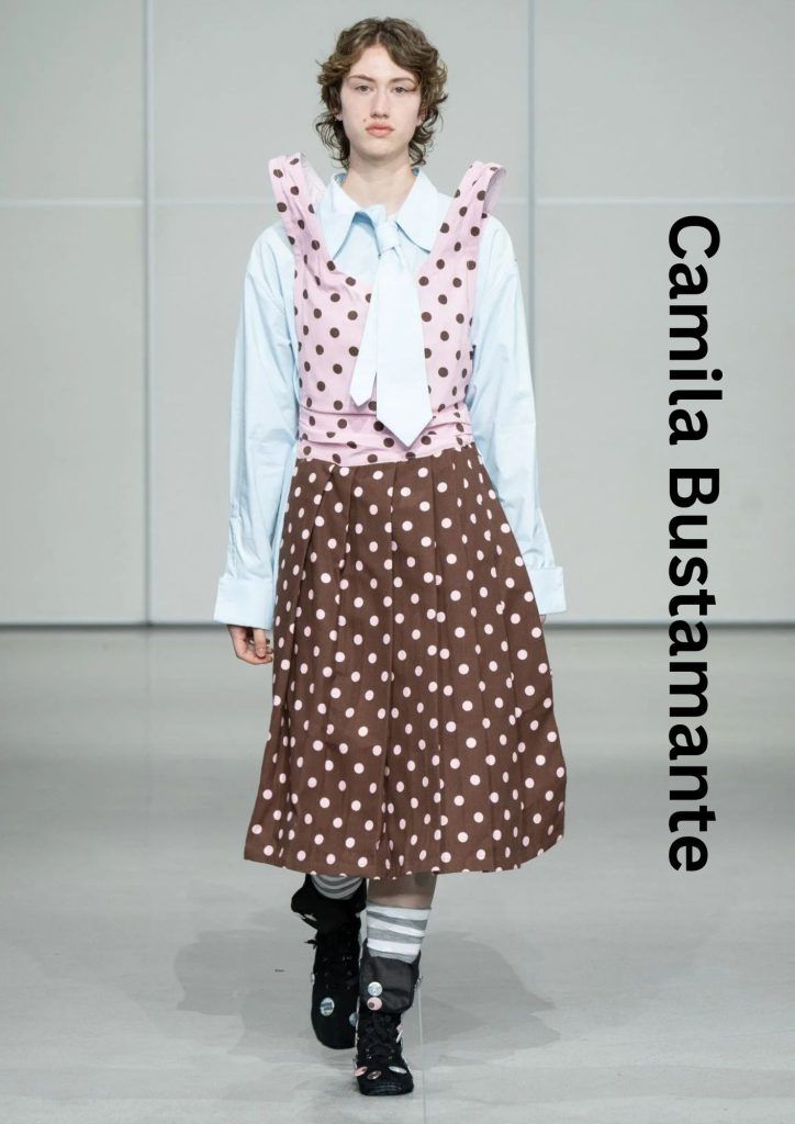 The review of her collection highlights a sophisticated tension between wearability and high-concept storytelling. While many graduate collections lean into the avant-garde, Bustamante’s pieces—noted for their functional details like zippers and utilitarian fabrics—maintained a grounded sense of reality. Critics praised her use of distorted proportions and "off-ish" construction, such as skirts cut purposefully short and exaggerated layering, to capture the inherent discomfort of the teenage years. Ultimately, her 2025 showcase served as a poignant "personal archive" of the internet age, marking her as a designer who masterfully blends cultural memory with modern textile innovation.