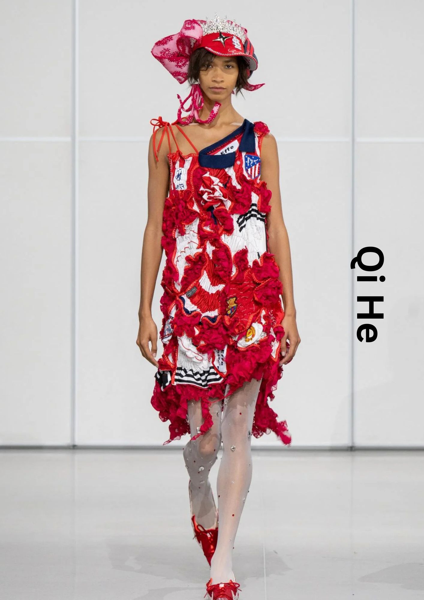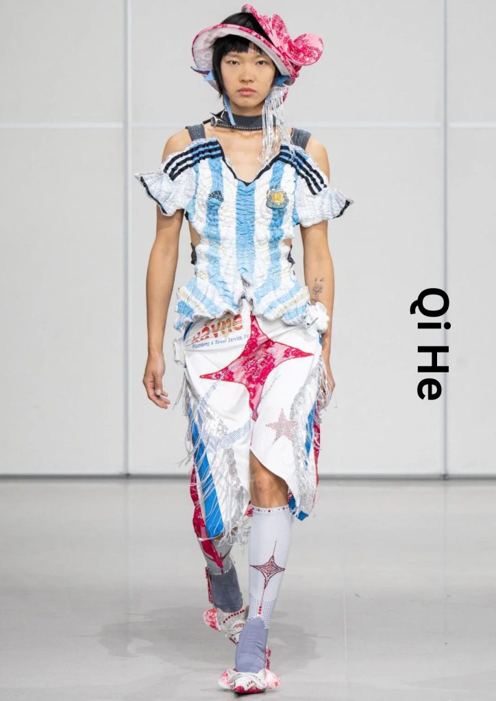 Qi He, known professionally as Effe Qi He, presented a standout collection titled "31: Offside Identity" at the Parsons MFA Fashion Runway Showcase 2025. Her work served as a powerful manifesto on the shifting nature of femininity, drawing heavy influence from the world of vintage sportswear and athletic uniforms. He's collection was celebrated for its bold juxtaposition of traditionally "masculine" utility with delicate, hyper-feminine details. By deconstructing sports jerseys often found in New York vintage shops and reassembling them with intricate lace and neon accents, she created a visual language that challenged the rigid codes of performance-wear and gendered dress.