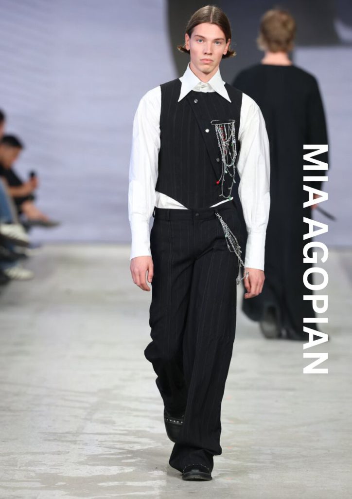 Mia Agopian focused on the feeling of being an "outsider," using deconstructed silhouettes to represent the fragmented nature of modern identity.
