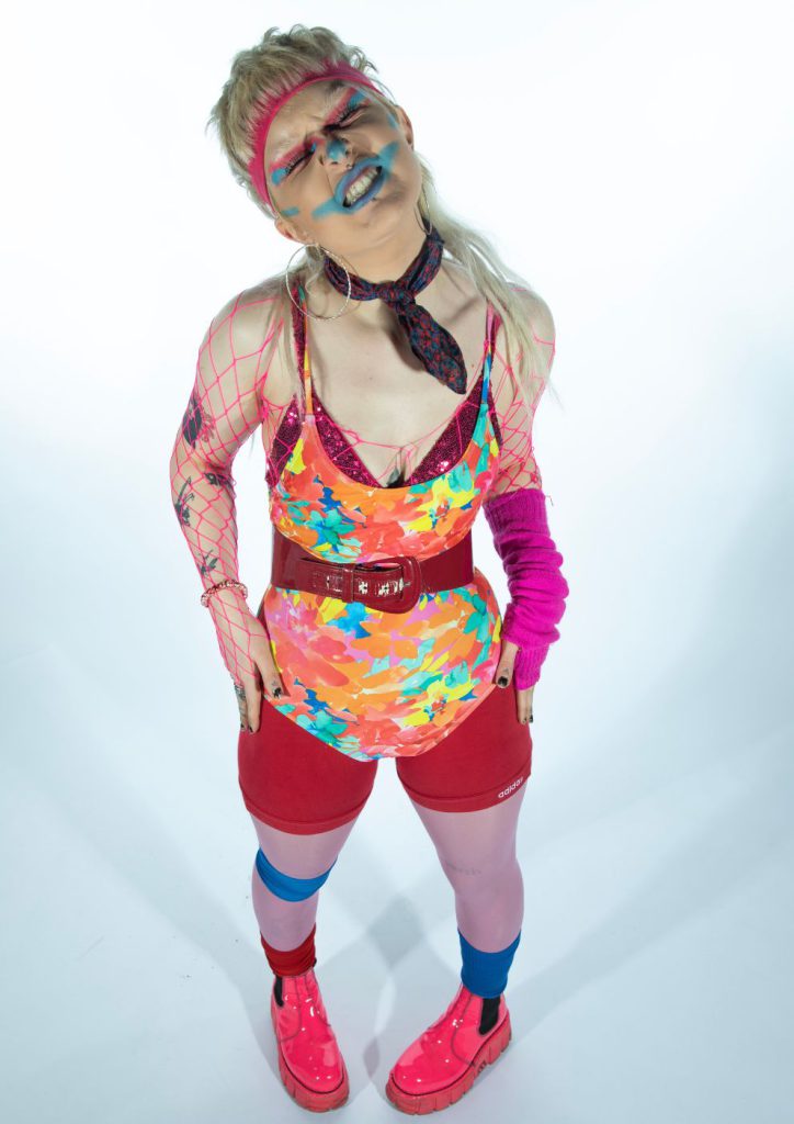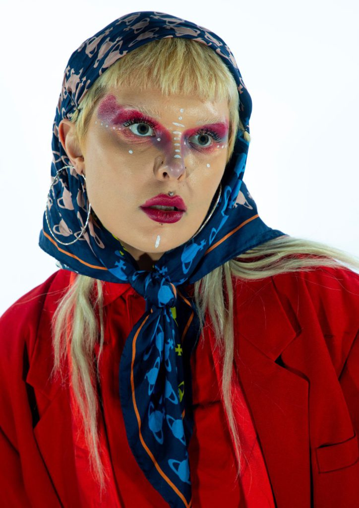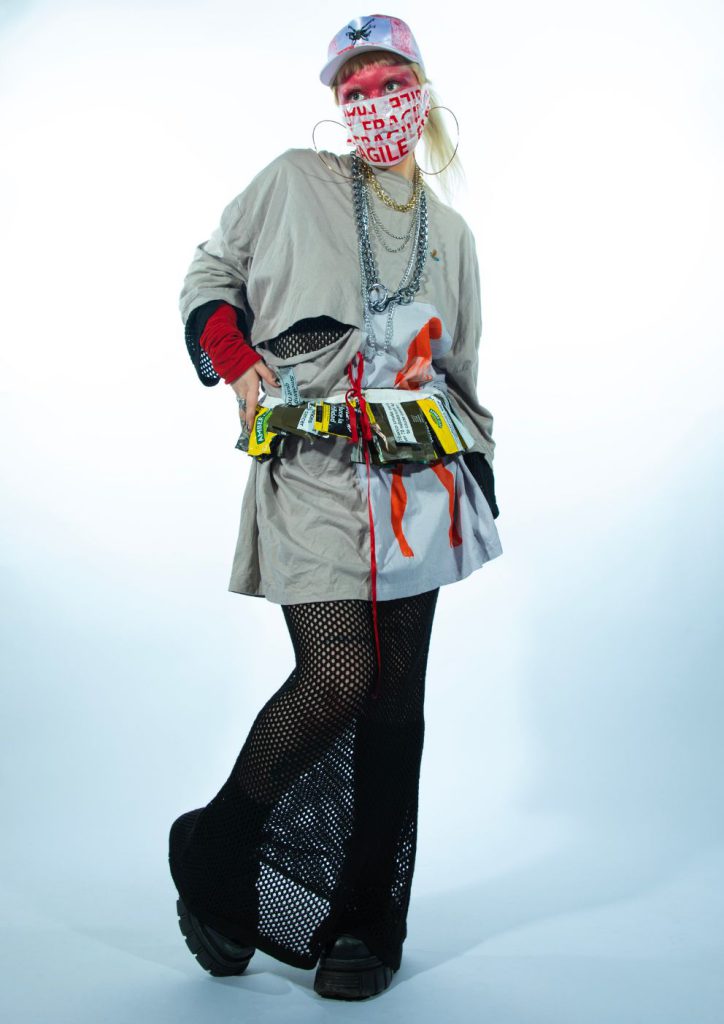 This "charity-shop-core" ethos was on full display during our session. One look featured a Vinted jumpsuit splattered with fake blood and "Only Pretending" embellished across the back, paired with boxing shorts, Vivienne Westwood trainers, and—most strikingly—industrial "Fragile" tape. For Sasha, the materials are secondary to the feeling. Whether it’s a £1.49 blazer she dissected herself or a real silk Westwood scarf from her days working at the iconic label, every piece is a tool for emotional provocation. “I like the idea that people might gasp when they see me,” she admits. “I like confusing people. Some people go out or eat to feel something; mine is putting on an outfit.”