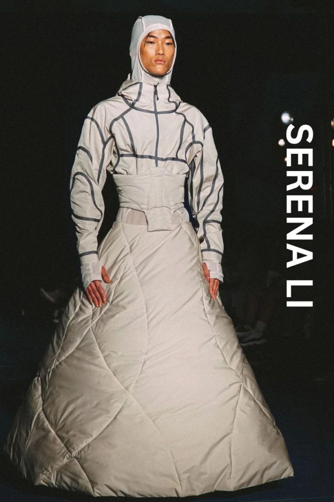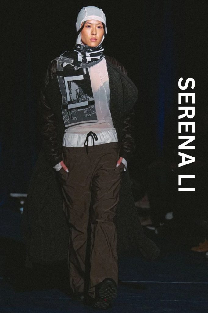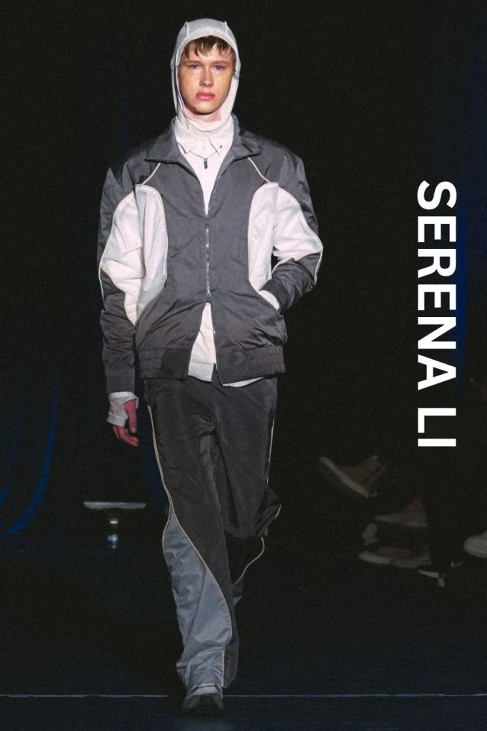 Serena Li’s collection was a masterclass in "subverting security." She took the hallmarks of high-performance techwear—ripstop nylons and weather-resistant fabrics—and paired them with sheer mesh to create a "paradox of exposure."