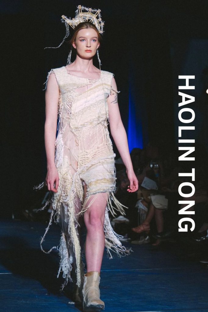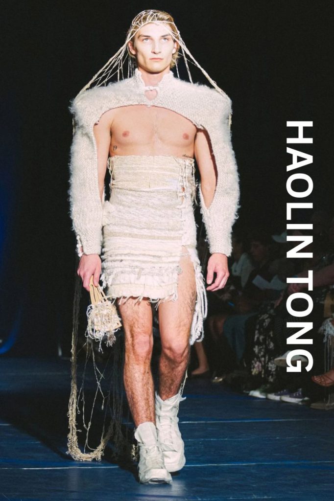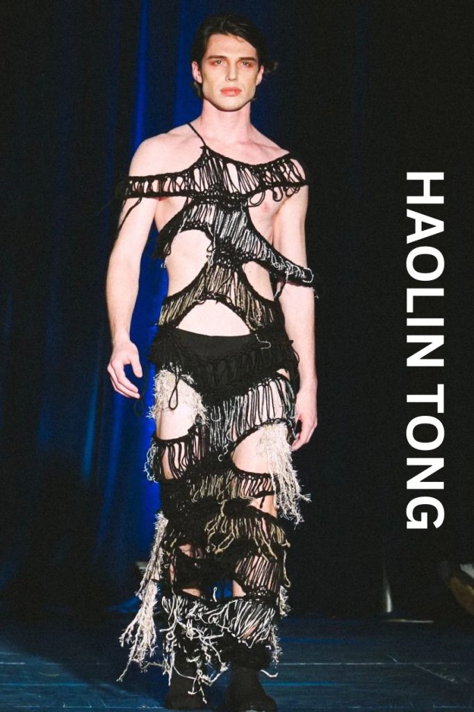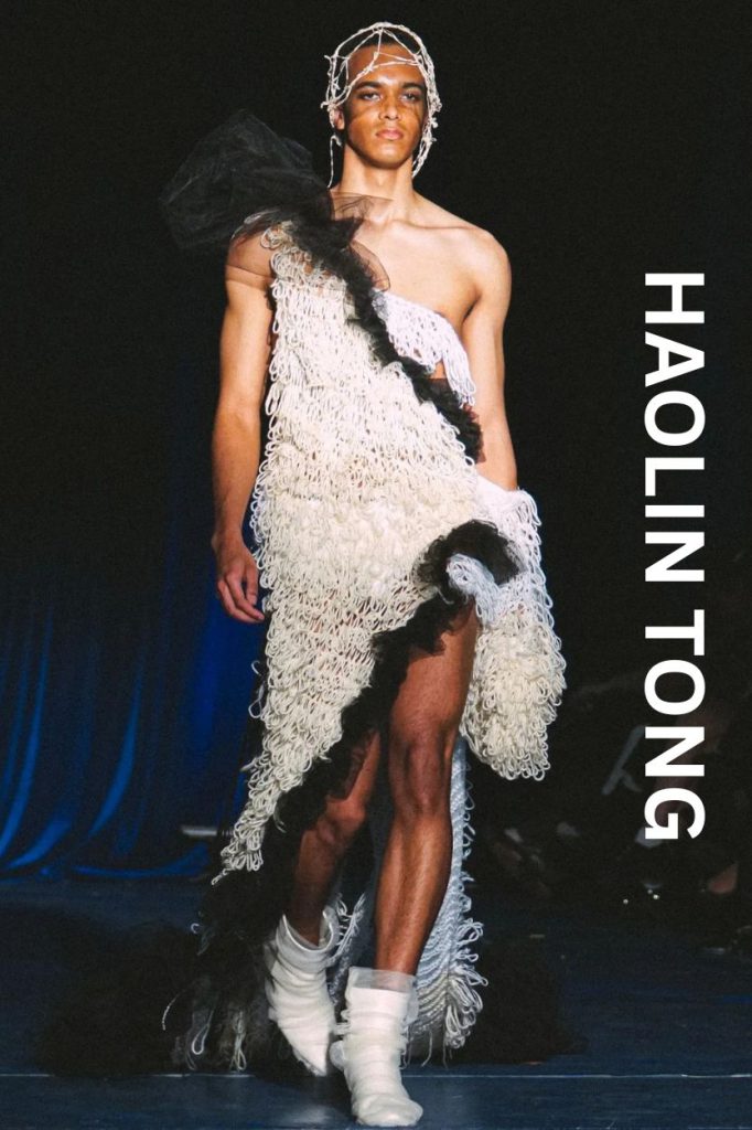 Transitioning from Fashion Communication to Design, Haolin Tong delivered one of the most intellectually stimulating collections of the night. Titled "Phoniness," the collection explored how we perform identity differently in private versus public spaces.