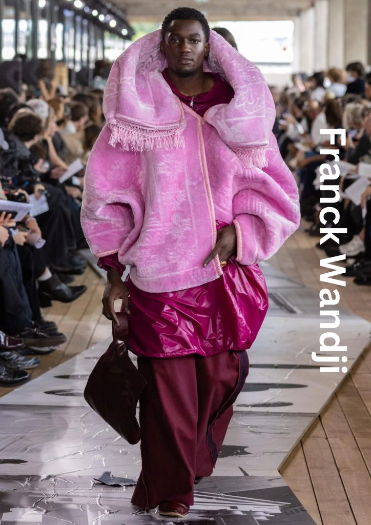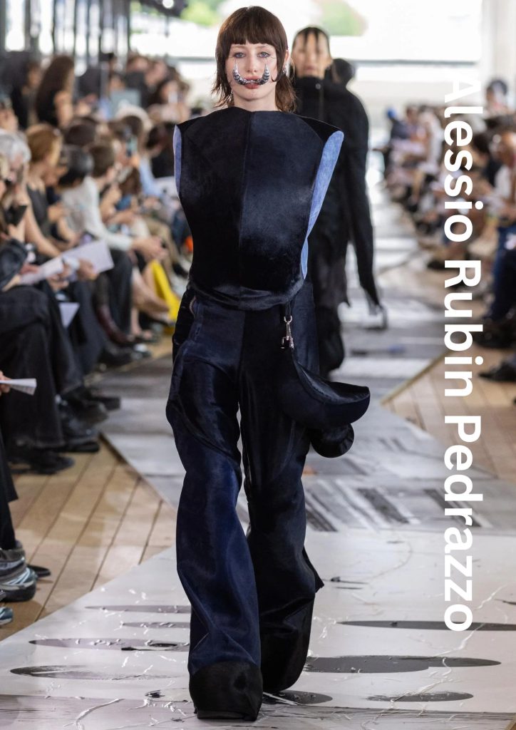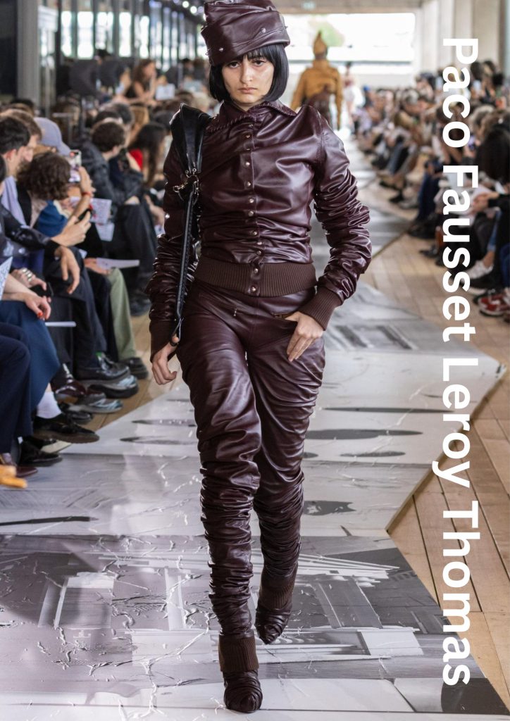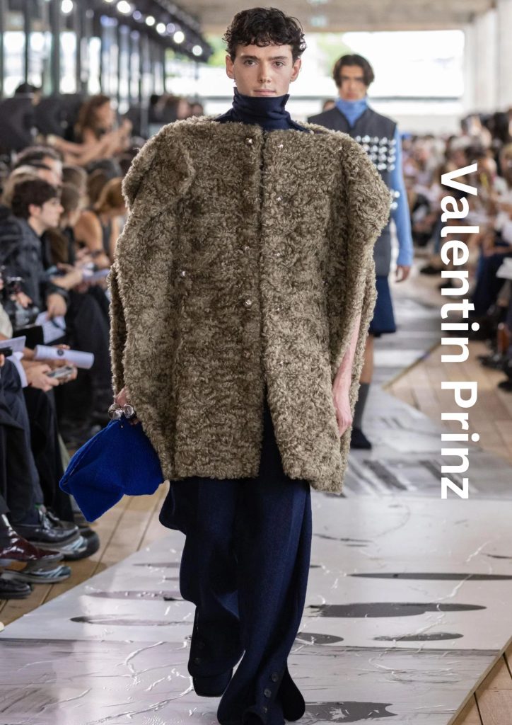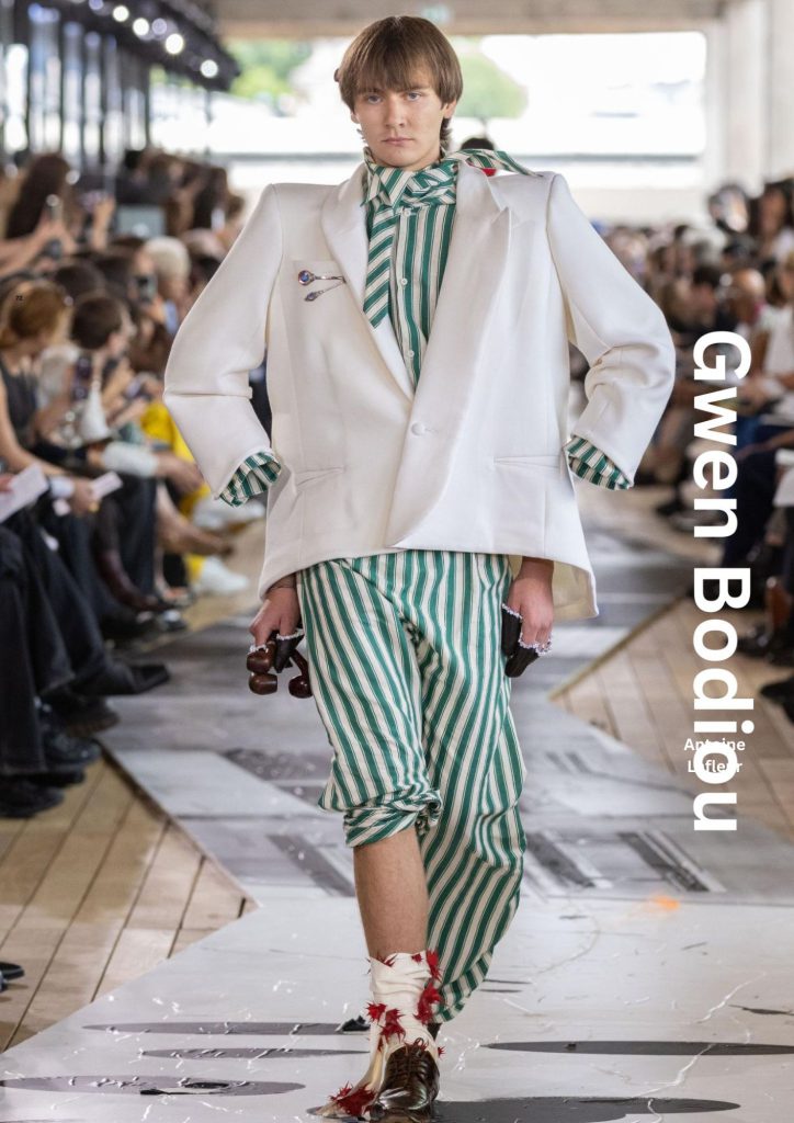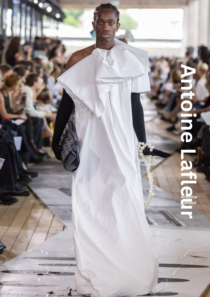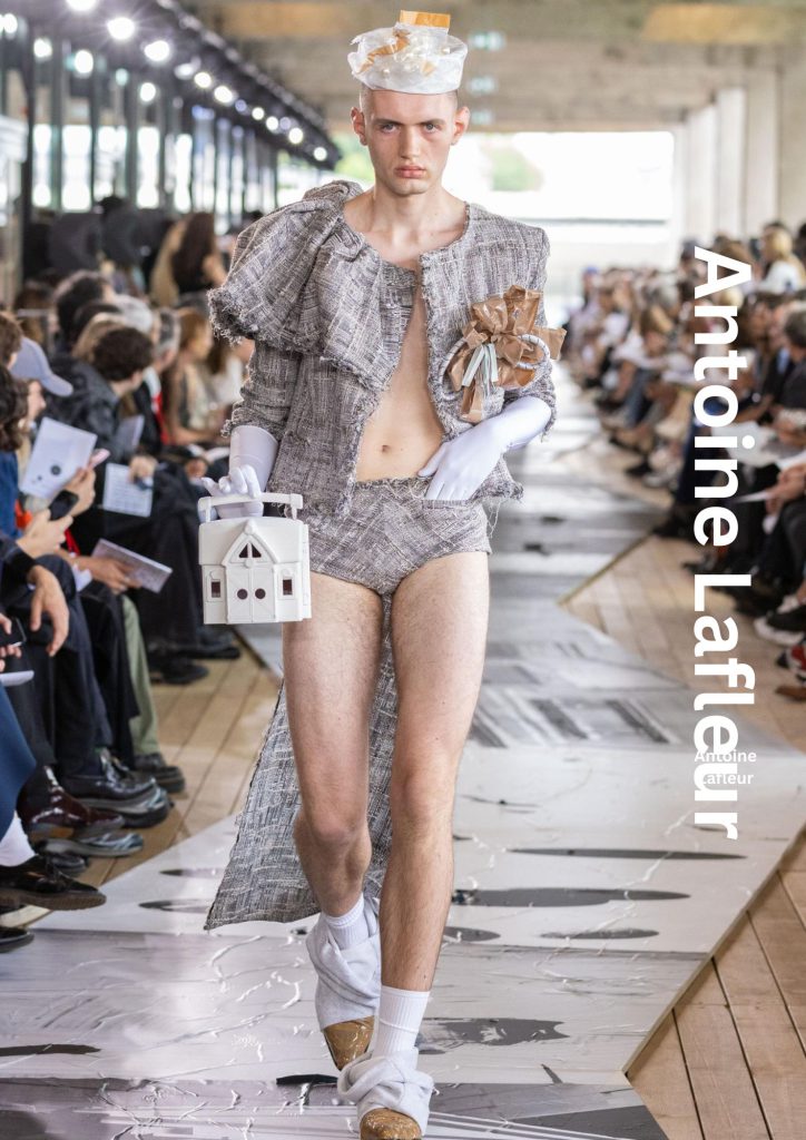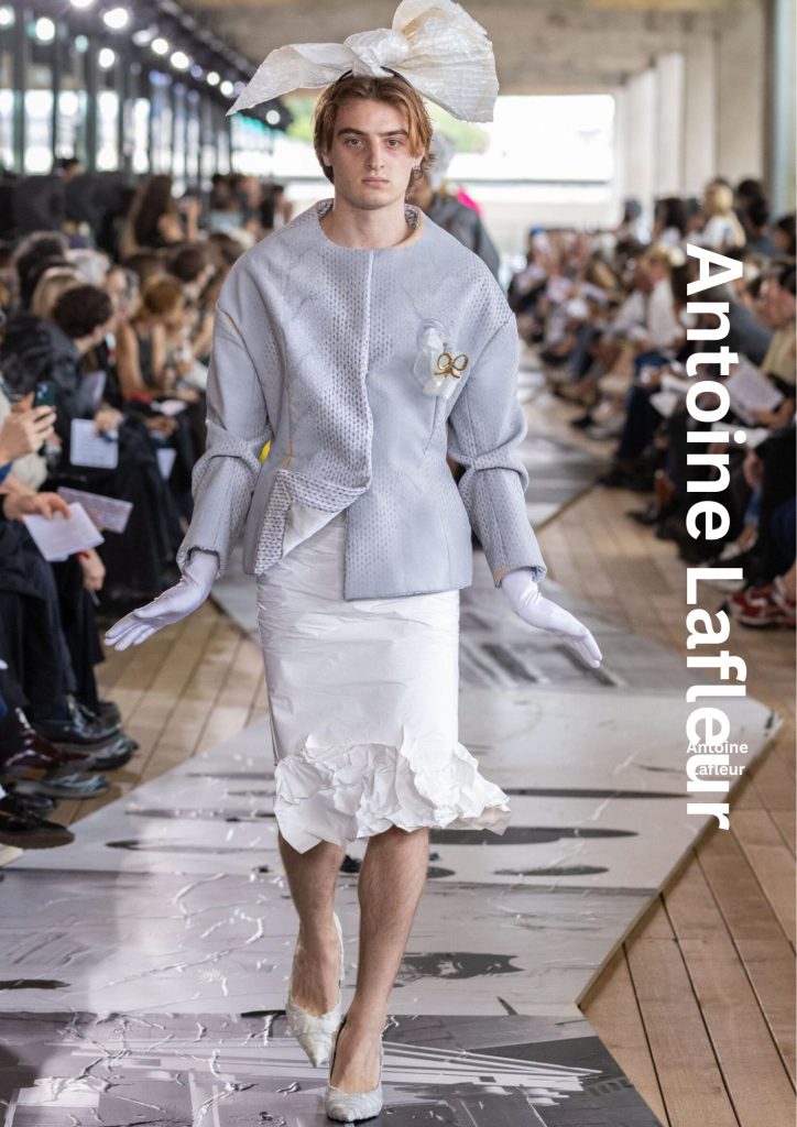 “If I had to sum it up in a few sentences, I would say that this collection features silhouettes imbued with a naïve clumsiness,” says the designer Antoine Lafleur. “It reveals, in a childlike manner, how to create a counterfeit synthetic elegance with whatever is at hand.” The aim of the collection was to create a conversation between a normal guy growing up in the world and a fashion student, growing into the fashion sphere. To make this happen, he juxtaposed 50s and 60s haute couture references that he discovered throughout his research, with something super poetic, raw and basic about Paris, the urban landscapes, the textures, but also the people and their attitude. “My inspiration mainly comes from what surrounds me, the conversations I have, the people I love, and the banality of everyday life that everyone tries in their own way to shape into something exceptional,” he says. He loves sourcing new fabrics – each silhouette has a surprising element. Some of them have a special material, some have a really unusual fabric in general. “I like to show something literal while playing with the eye of the beholder,” he says. Bringing all his constant inspirations together was a challenge, but the result is a coherent, well-constructed, and of course, a surprising collection.