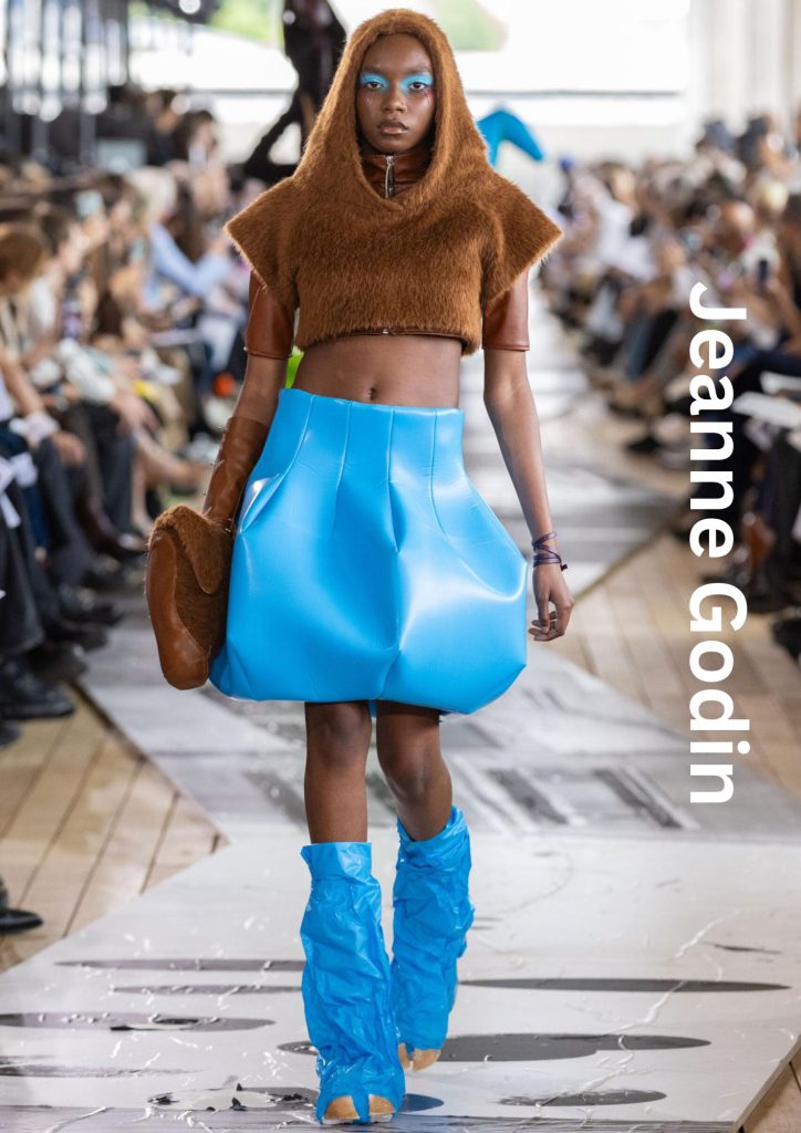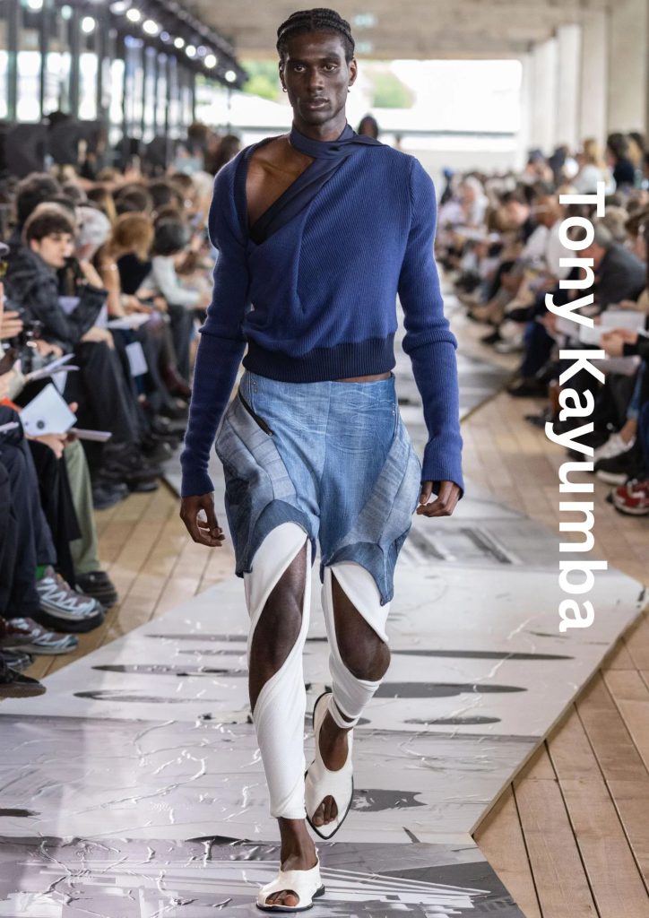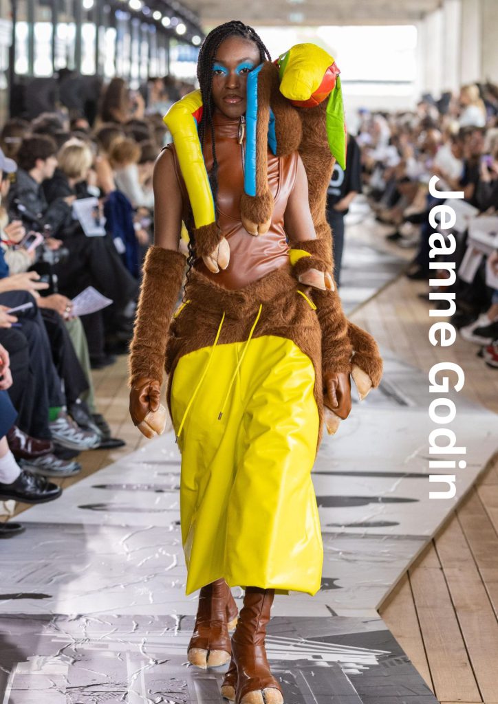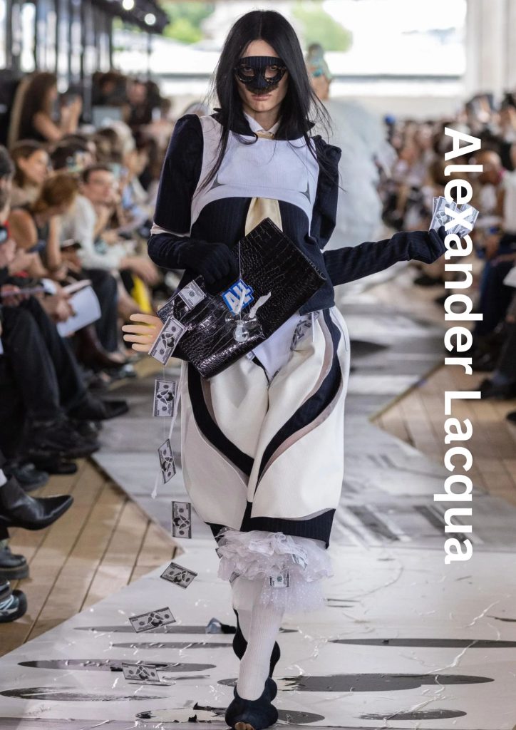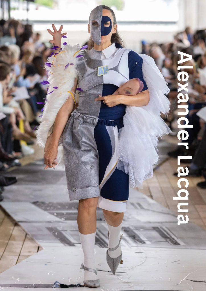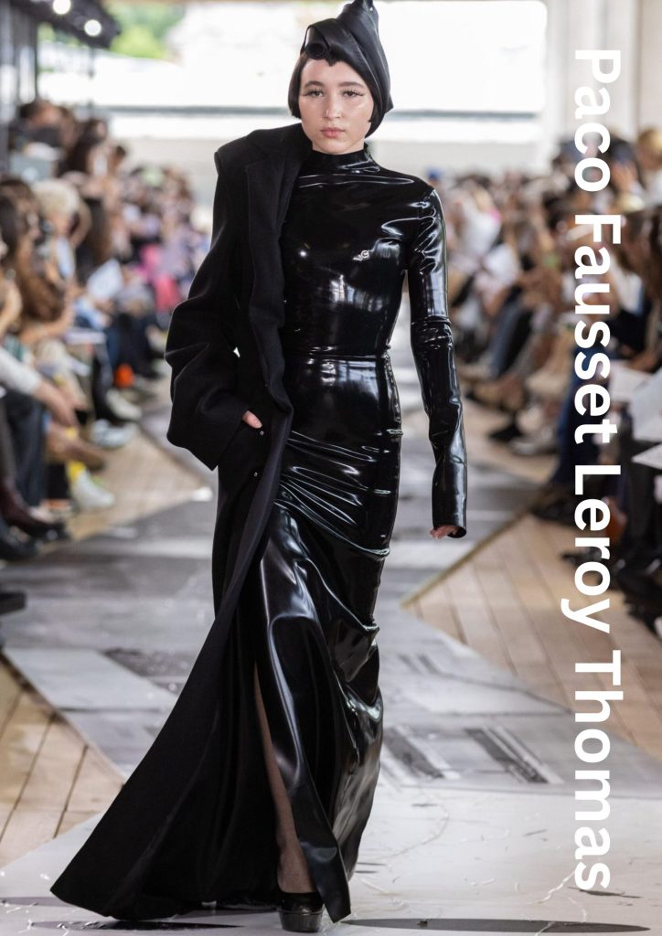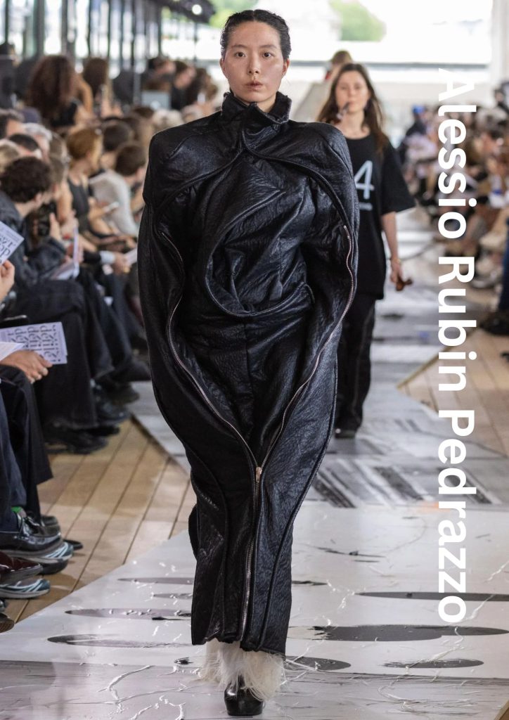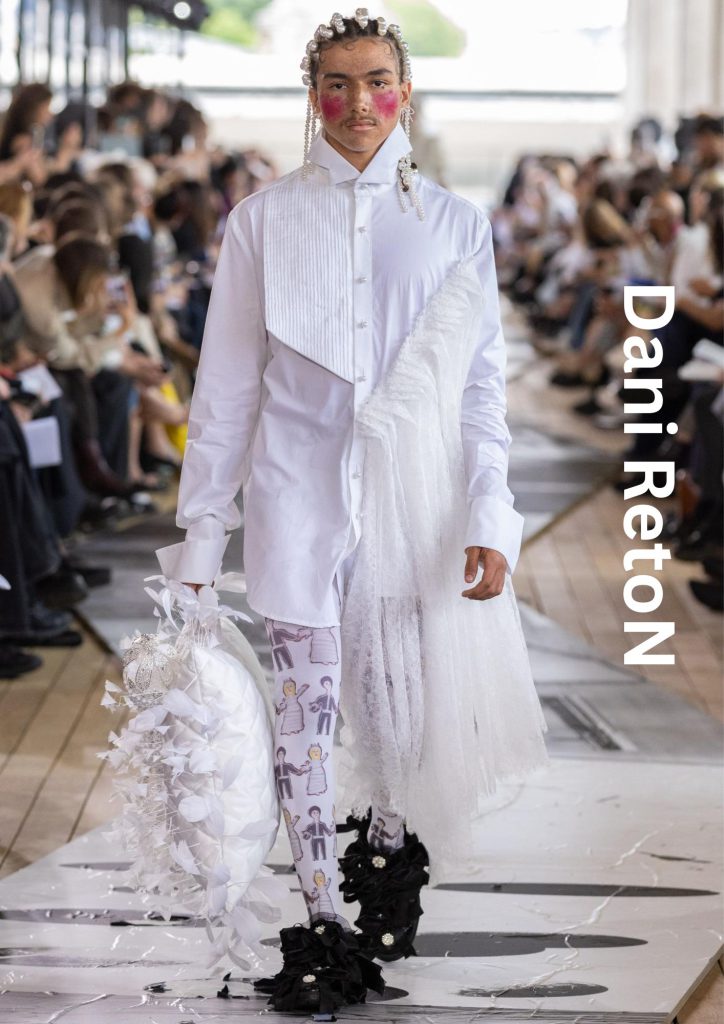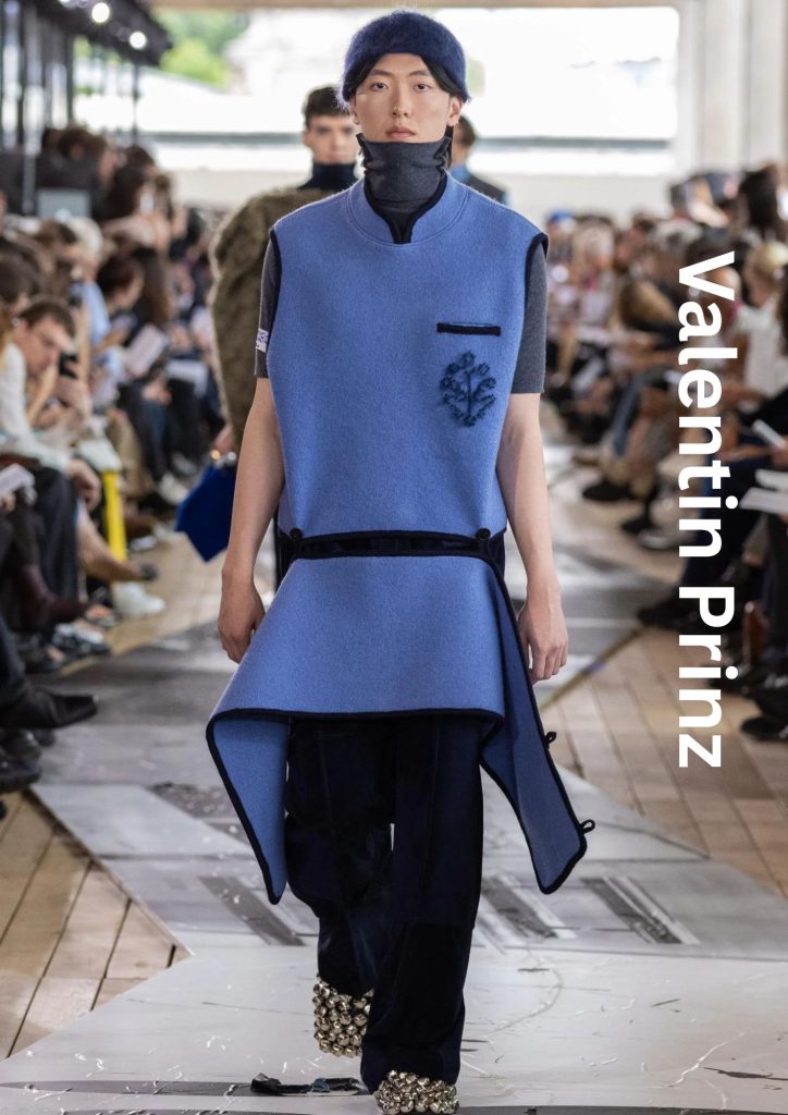 “If I had to sum it up in a few sentences, I would say that this collection features silhouettes imbued with a naïve clumsiness,” says the designer Antoine Lafleur. “It reveals, in a childlike manner, how to create a counterfeit synthetic elegance with whatever is at hand.” The aim of the collection was to create a conversation between a normal guy growing up in the world and a fashion student, growing into the fashion sphere. To make this happen, he juxtaposed 50s and 60s haute couture references that he discovered throughout his research, with something super poetic, raw and basic about Paris, the urban landscapes, the textures, but also the people and their attitude. “My inspiration mainly comes from what surrounds me, the conversations I have, the people I love, and the banality of everyday life that everyone tries in their own way to shape into something exceptional,” he says. He loves sourcing new fabrics – each silhouette has a surprising element. Some of them have a special material, some have a really unusual fabric in general. “I like to show something literal while playing with the eye of the beholder,” he says. Bringing all his constant inspirations together was a challenge, but the result is a coherent, well-constructed, and of course, a surprising collection.