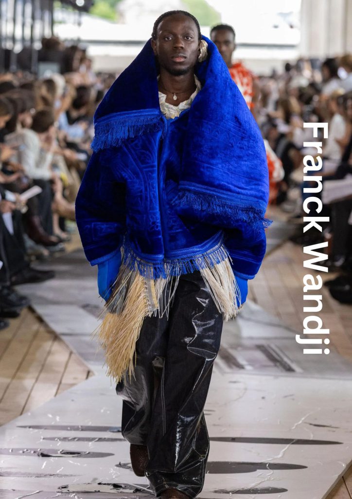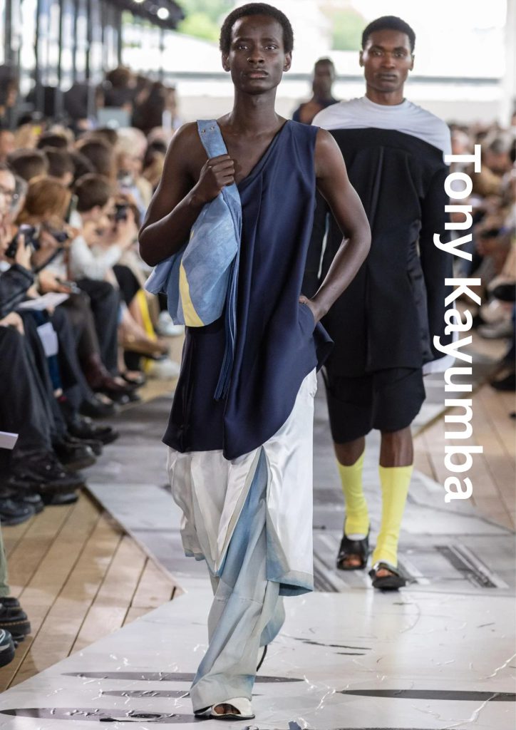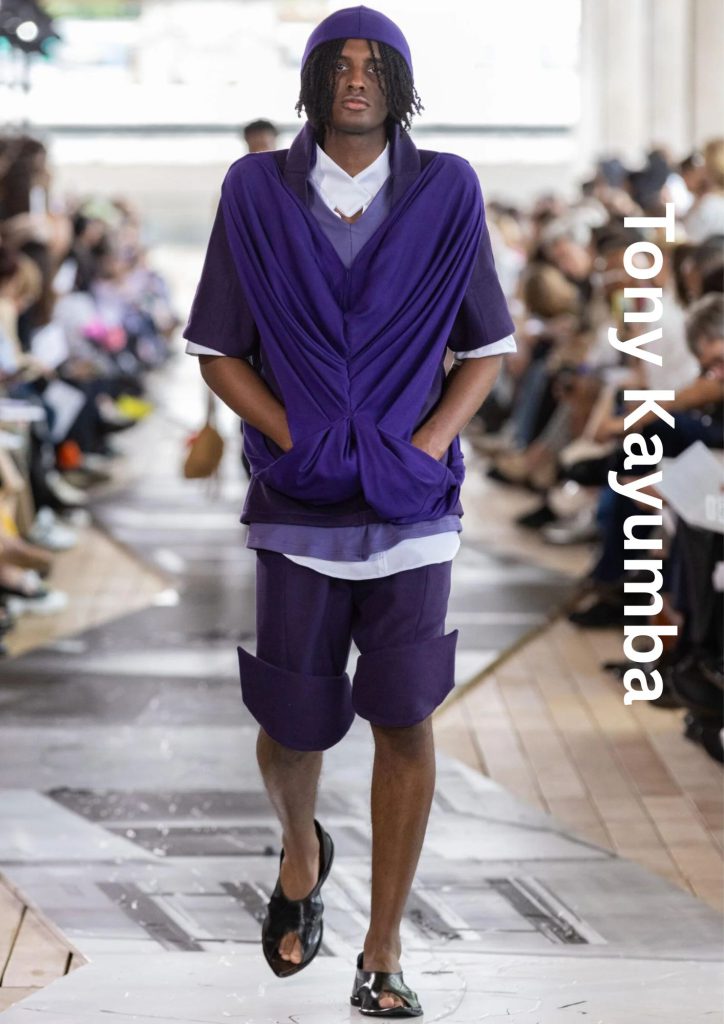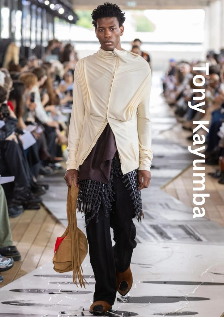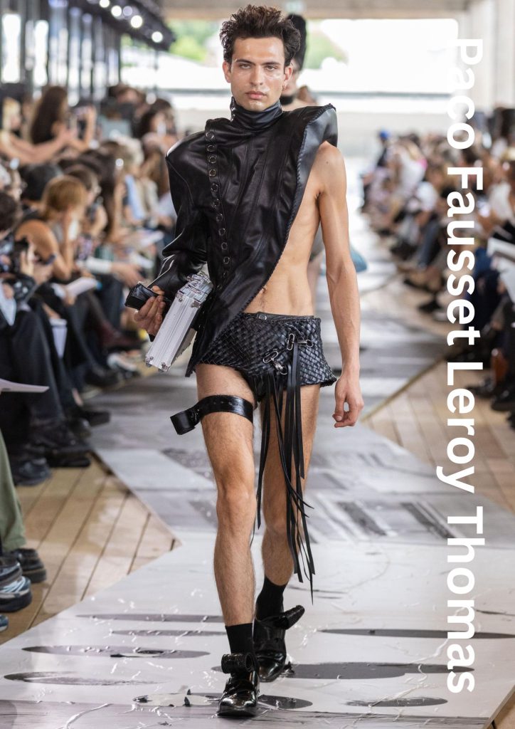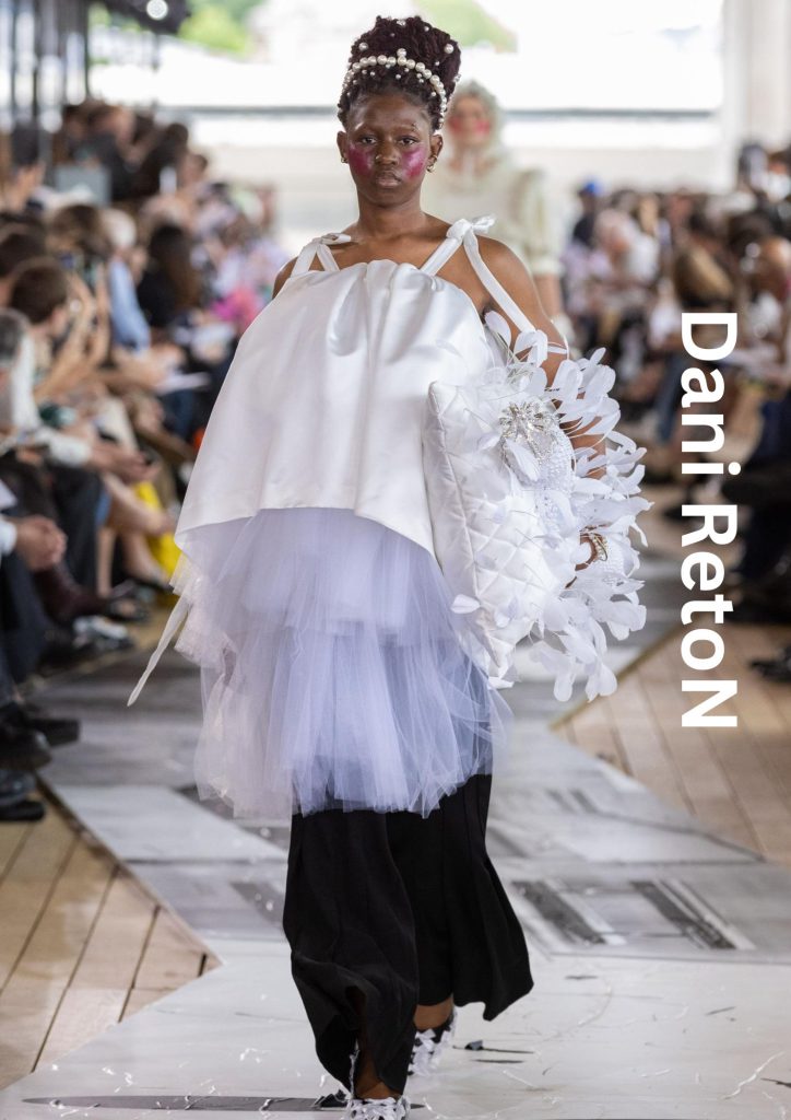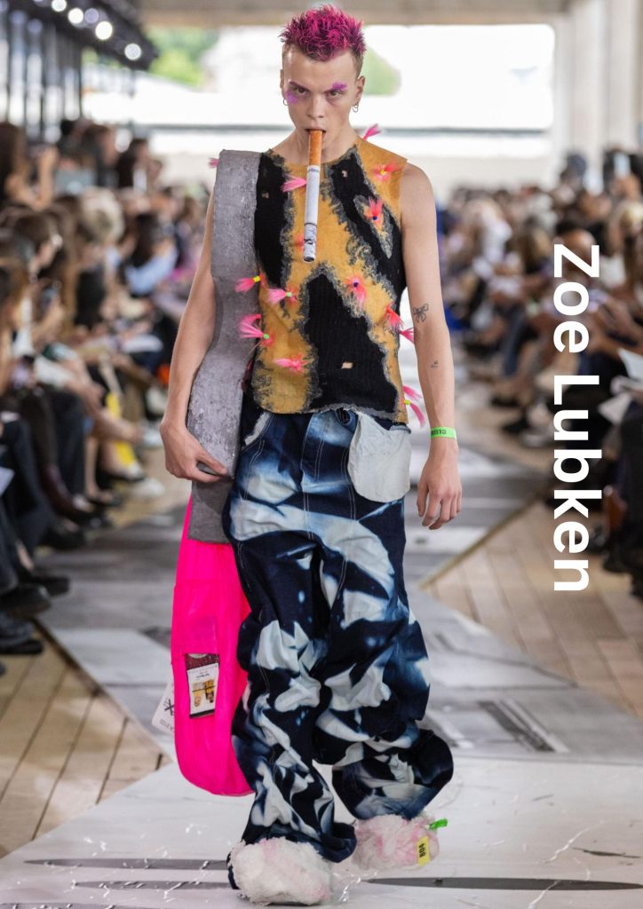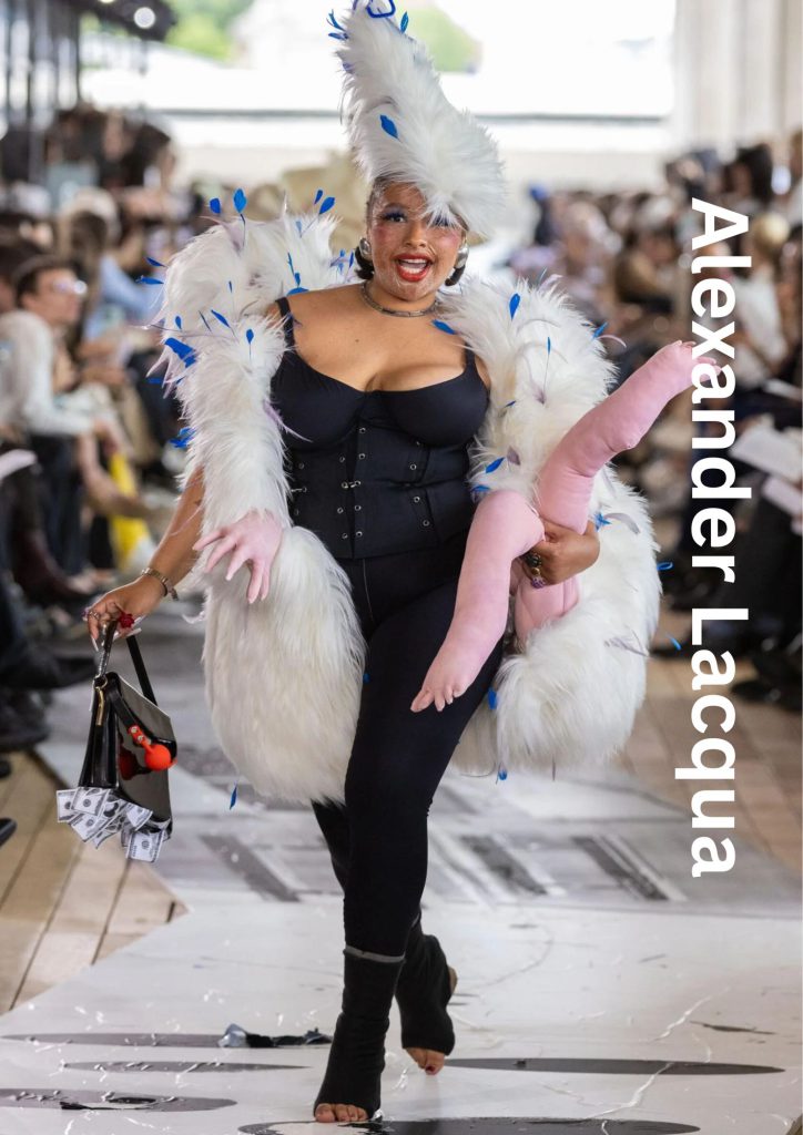 “If I had to sum it up in a few sentences, I would say that this collection features silhouettes imbued with a naïve clumsiness,” says the designer Antoine Lafleur. “It reveals, in a childlike manner, how to create a counterfeit synthetic elegance with whatever is at hand.” The aim of the collection was to create a conversation between a normal guy growing up in the world and a fashion student, growing into the fashion sphere. To make this happen, he juxtaposed 50s and 60s haute couture references that he discovered throughout his research, with something super poetic, raw and basic about Paris, the urban landscapes, the textures, but also the people and their attitude. “My inspiration mainly comes from what surrounds me, the conversations I have, the people I love, and the banality of everyday life that everyone tries in their own way to shape into something exceptional,” he says. He loves sourcing new fabrics – each silhouette has a surprising element. Some of them have a special material, some have a really unusual fabric in general. “I like to show something literal while playing with the eye of the beholder,” he says. Bringing all his constant inspirations together was a challenge, but the result is a coherent, well-constructed, and of course, a surprising collection.