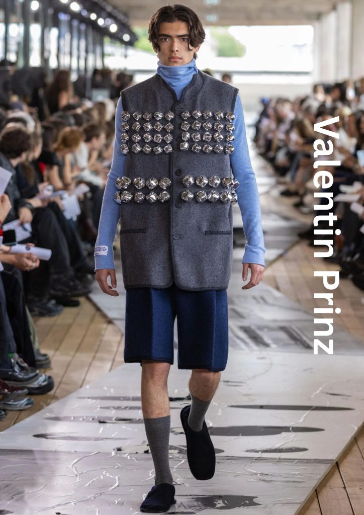 Valentin Prinz grew up in southern Germany. For his final collection he got very inspired by southern German traditional culture, garments and minimal art. “I reimagined garments that have been handed down through generations in my family, aiming to evoke memories such as the sound of cowbells in the fields surrounding my childhood home and the Swabian Alemannic Fastnacht parades with their bell-embellished costumes,” he says. For his collection, he wanted to blend these traditions with his passion for minimal art. The simple shapes and the act of repetition create an unexpected harmony between the two. “The process began with a journey through photo albums of my childhood and those of my mother and grandmother,” he says. “I observed how garments and traditions were preserved and passed down through generations. I studied the construction and materials of these heirloom garments. I frequently explored connections to works to minimal art.” In the end, he focussed on individual pieces, rather than full looks, constantly styling and editing the collection. “Essentially, I was creating a wardrobe. The wearer and their comfort played a central role,” he finishes.