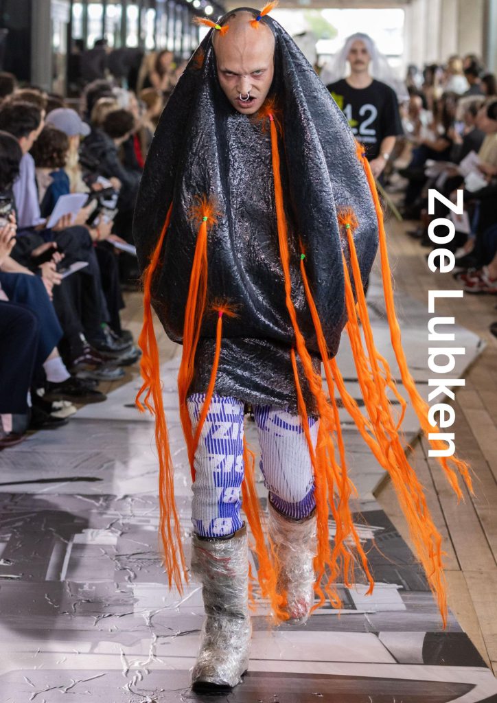 Unleased during night life – the true and authentic self that emerges when we are able to let loose far from social constraints,” they say. You may think they are strange, but they exist to embrace the strange. They embrace themselves to the fullest. “For this collection, I drew inspiration from the crazy creatures of the night that I have encountered, and all that they have taught me,” they add. Zoe chose this theme, because the monsters encapsulate their chaotic tendencies. “I decided to reclaim all the things I was shamed for and turn them into my signature club bizarre trademarks. Wrinkled dirt coated clothes left at the back of the club became my fabric treatment, coming sweaty out of the club became a “sweat” scotch sweater, the t shirt that I would wear upside down gave me inspiration for the giant custom clothing tags, having to walk out of the club without my pants having lost them gave me inspiration for the giant latex bob and a messy bag became a hooping chewing gum bag full of lost junk.” This collection is a testament of reclaiming inner insecurities, but also a way to show how proud you should be of yourself, no matter what the others say.