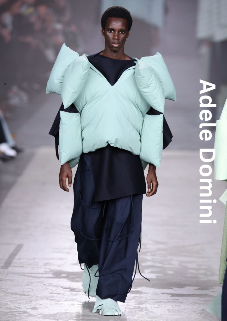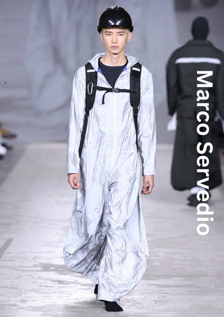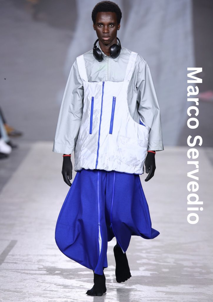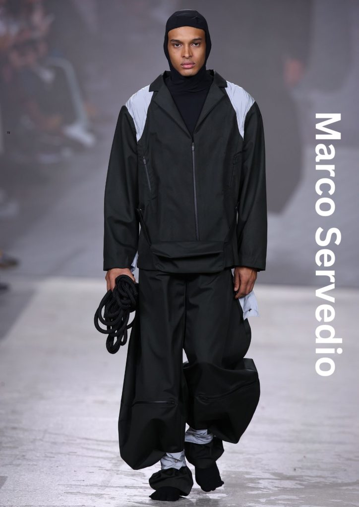Winner of the Fashion System Award was Marco Servedio, author of the 3K collection inspired by work on construction sites and his worker father, presented by Mario Boselli of Luxury Jersey. The catwalk show emphasized safety and risk prevention through worker’s uniforms in durable, high-performance technical fabrics made from Majotech fabrics and attentive to different physicality's. The garments featured technological inserts, such as LED lighting systems powered by batteries and solar panels, which charge during the day and release visibility when light is scarce; fasteners provide mobility and versatility, transforming part of the uniform into backpacks and helmet holders.