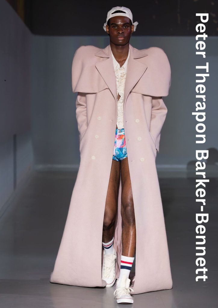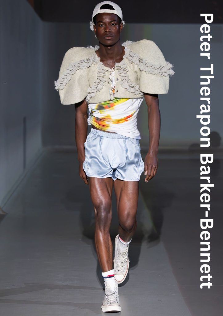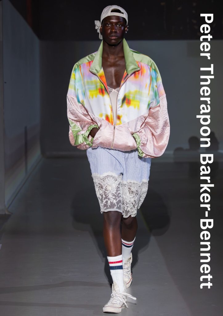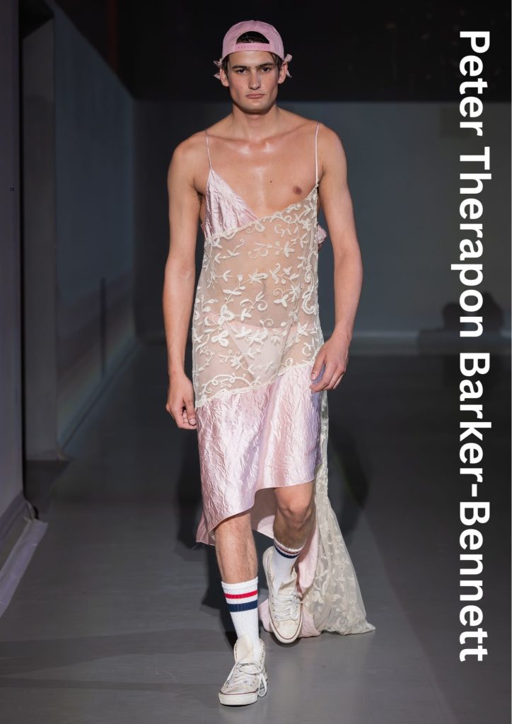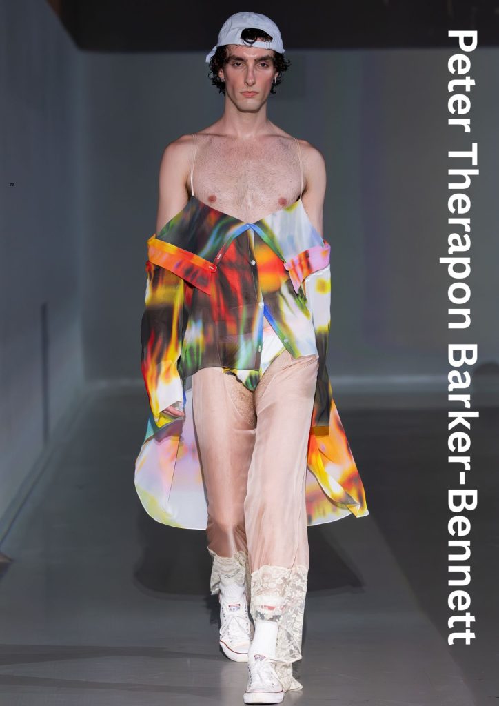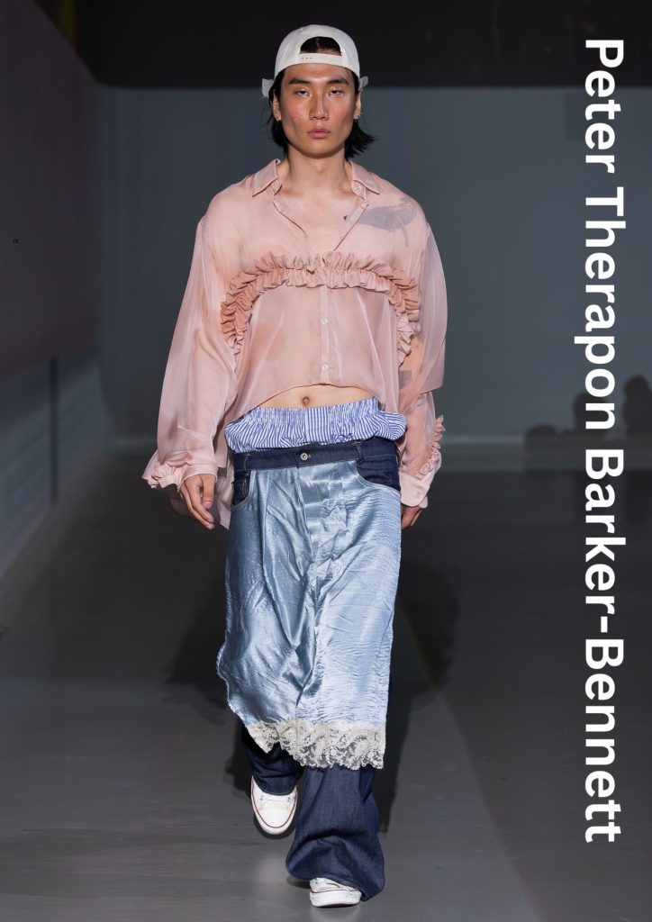 Peter Thanaphon Barker-Bennett’s collection titled Somewhere is a heartfelt tribute to filmmaking and photography, capturing the disillusioned emotions of coming-of-age through his garments. Using soft pastel hues and sheer silks, this up-and-coming fashion designer presents delicate and ethereal homoerotic menswear. Drawing inspiration from Sofia Coppola’s “Lost in Translation,” he explores themes of sensuality and homoeroticism with loose silhouettes, delicate rouge applications, and shimmering fabrics. Much like a cinematic frame, Peter Thanaphon Barker-Bennett embeds a Tokyo night street scene onto a shirt, seamlessly blending underwear with sportswear. This fusion artfully portrays the complex struggles of youth, encompassing loneliness, sensuality, and femininity.