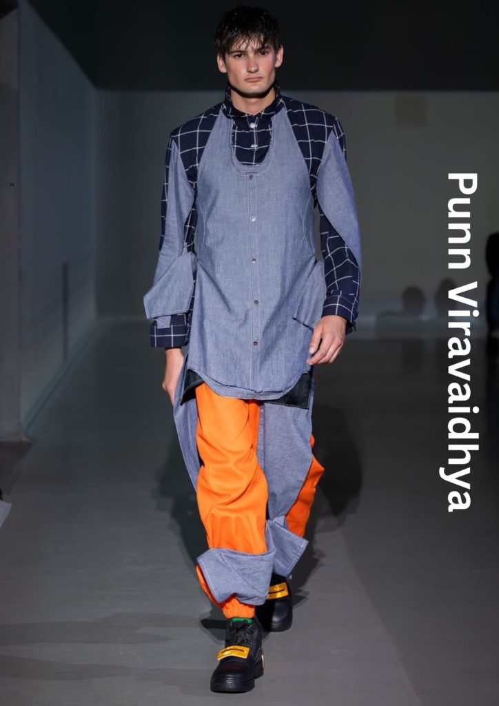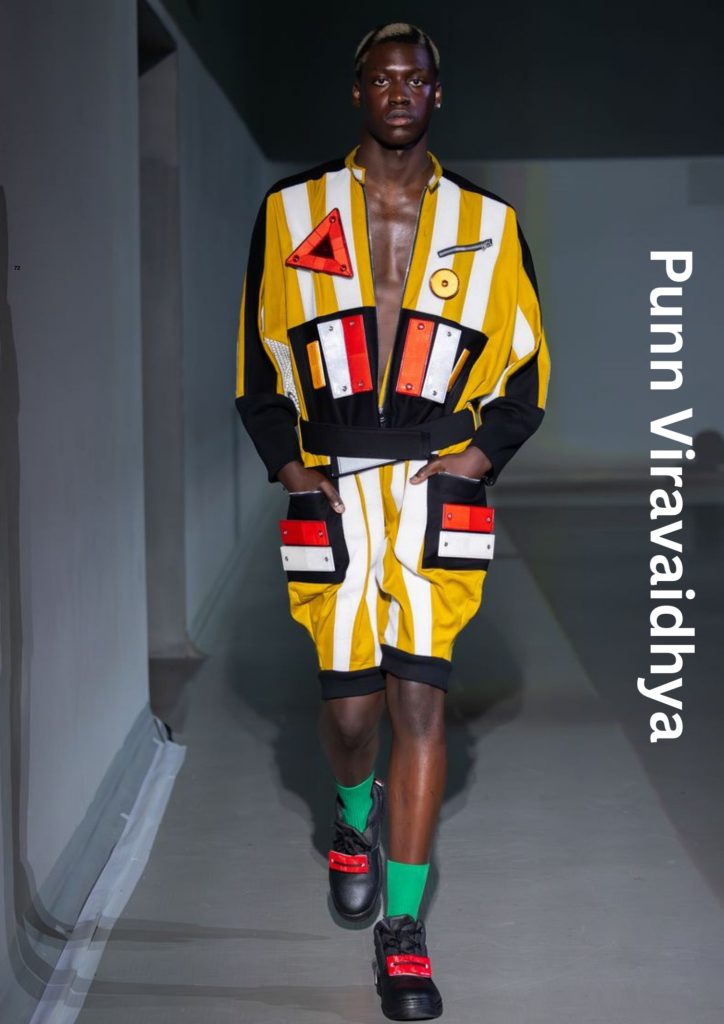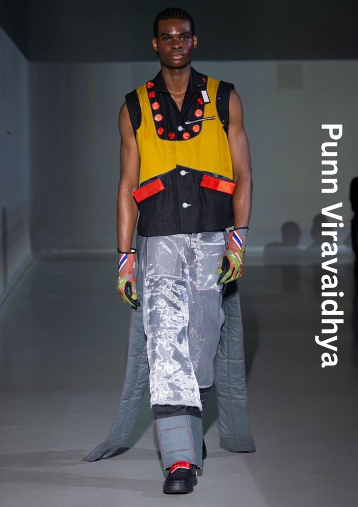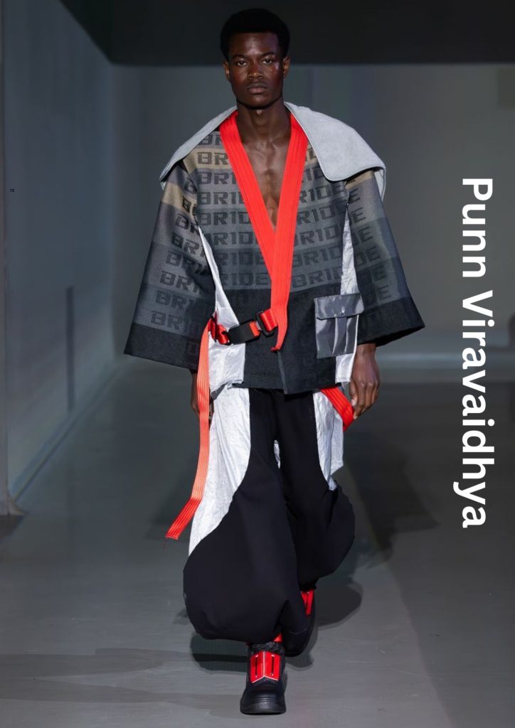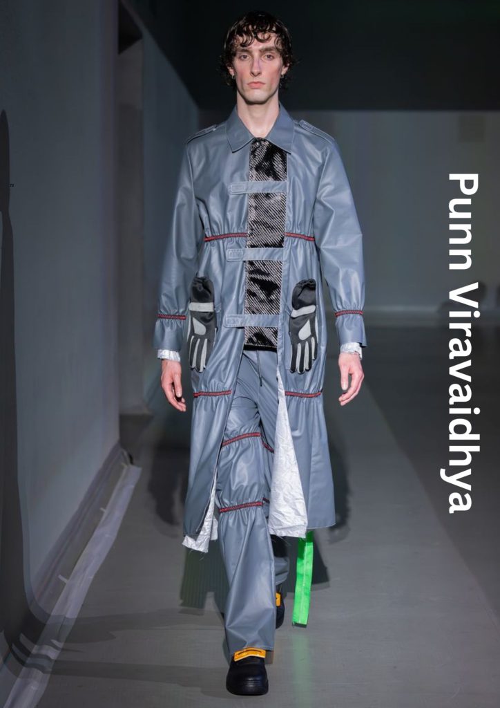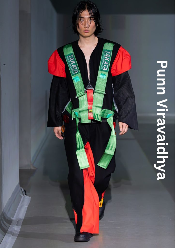 Punn Viravaidhya’s degree collection, The State of Being Distinct, translates his passion for modified Japanese car culture into a unique sense of fashion design. For this young designer, deconstructing and composing garments is akin to assembling the mechanical parts of a car. His innovative designs use unconventional fabrics such as car seat materials and carbon fibre, incorporating harnesses, seatbelts, gloves, and reflectors into silhouettes inspired by traditional Japanese workwear, merging them with contemporary design.