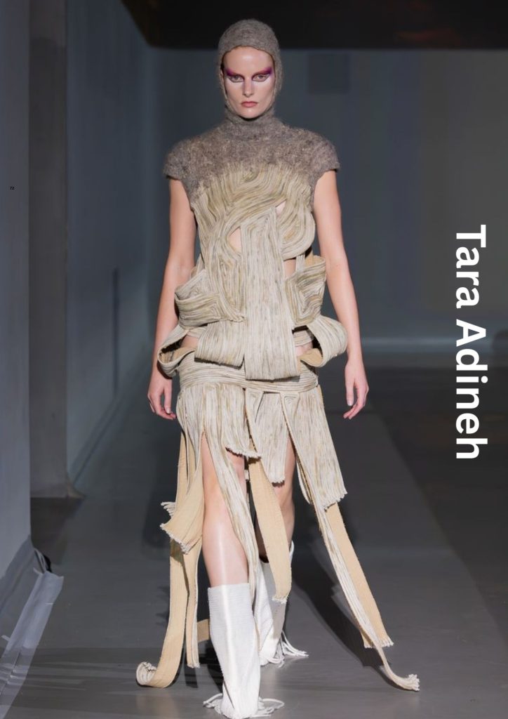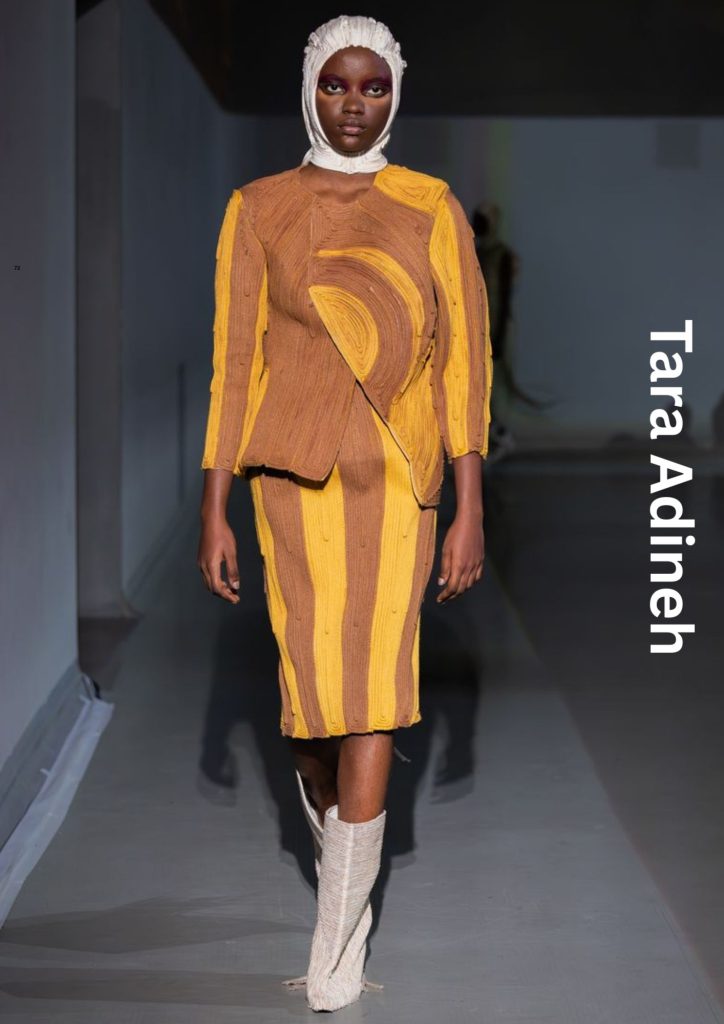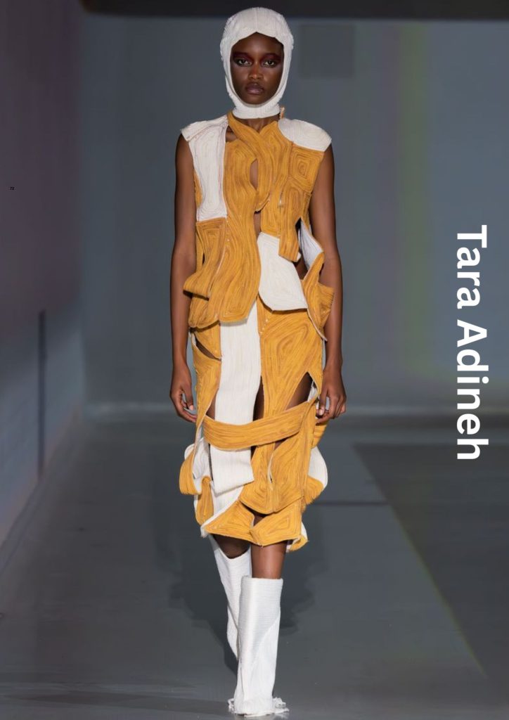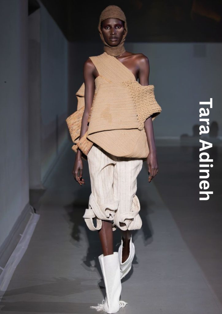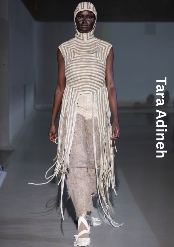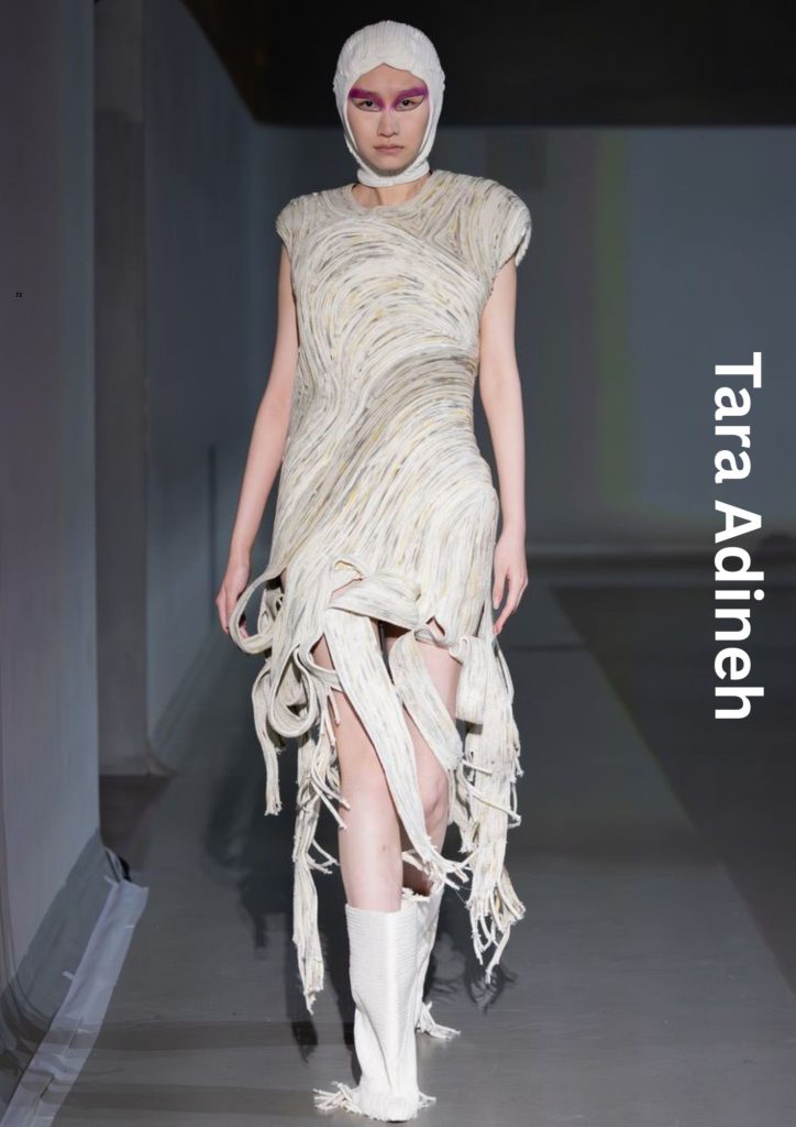 Tara Adineh’s collection, The Absurd Hero, interprets human existence by transitioning basket-making into garments that wrap the body like cocoons. Inspired by the Myth of Sisyphus and Albert Camus’ philosophy of the absurd, this rising talent transforms the concept of the absurd hero’s basket of rocks into design pieces that metaphorically turn the body into stone. Tara Adineh’s basket-weaving innovation involves transitioning knitting to flat, rigid stitched ropes, transforming a traditional craft into fabric, saving waste, and creating a sense of unity with the task.
