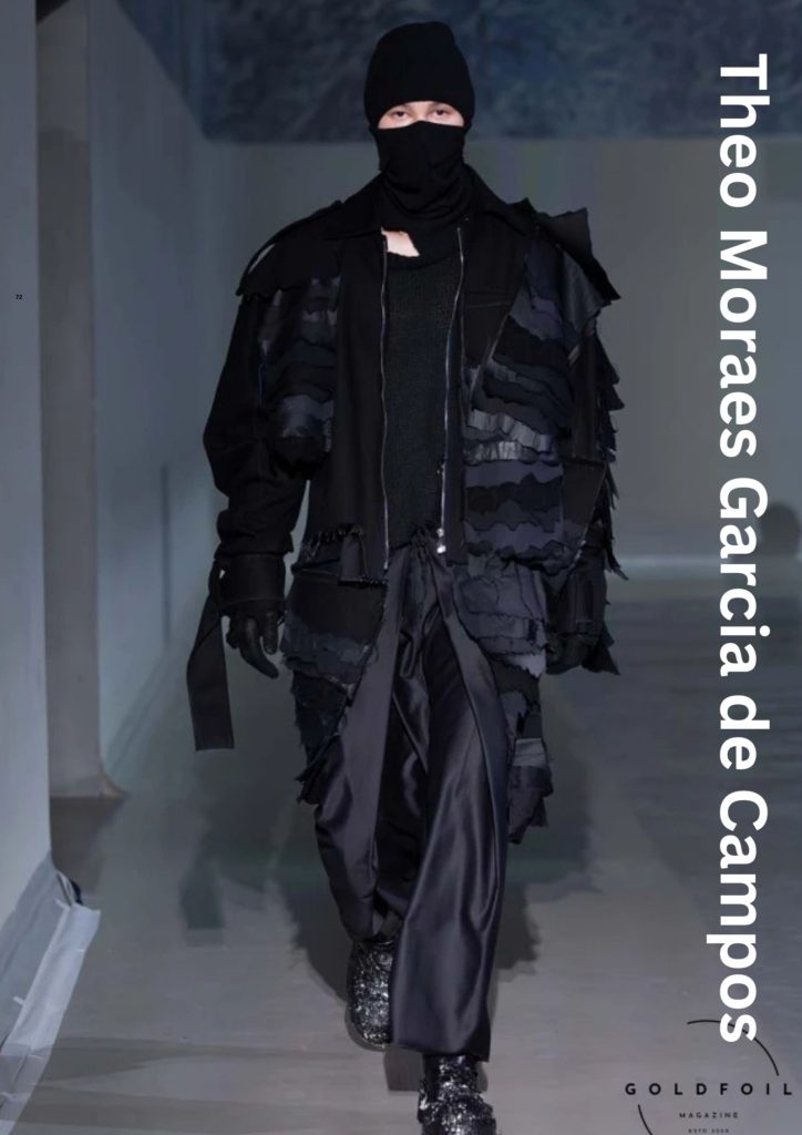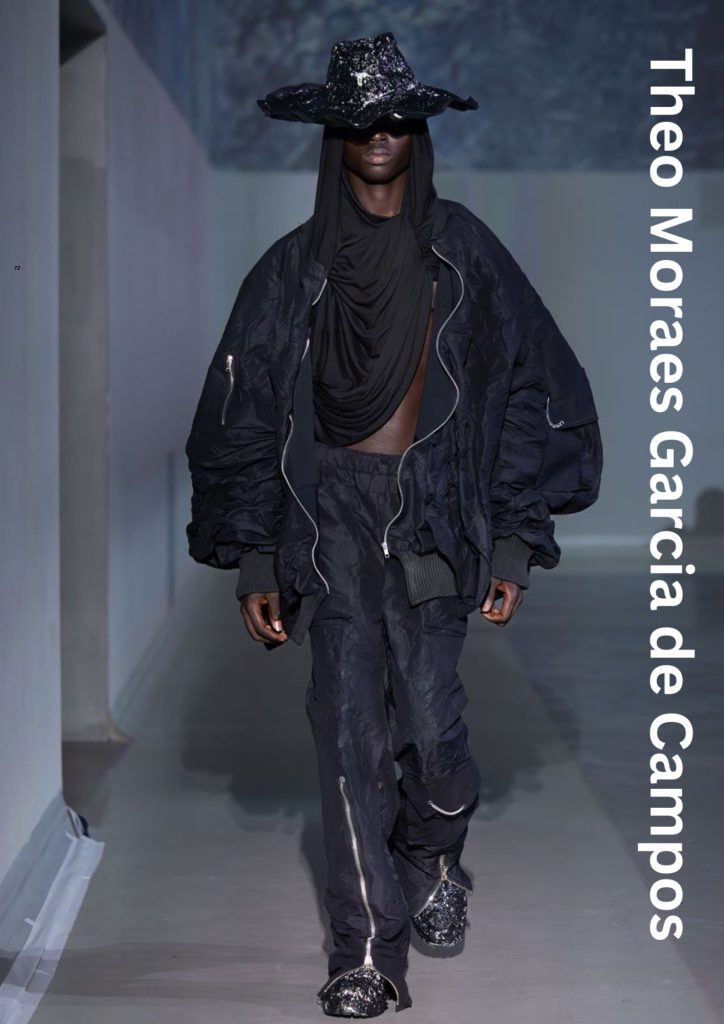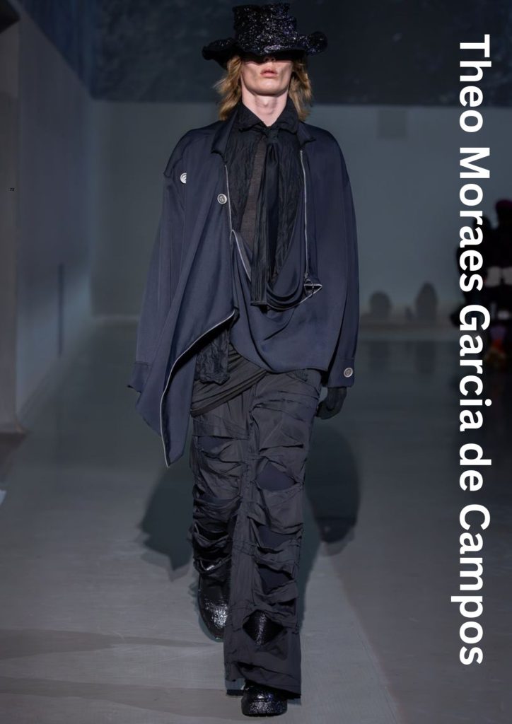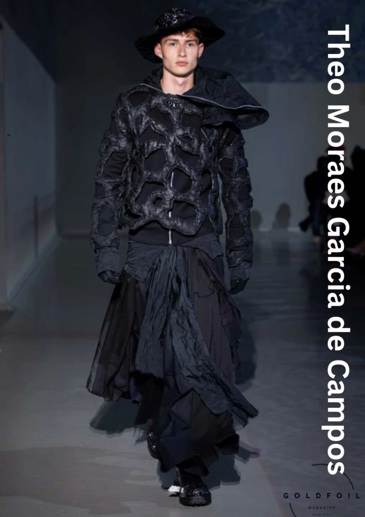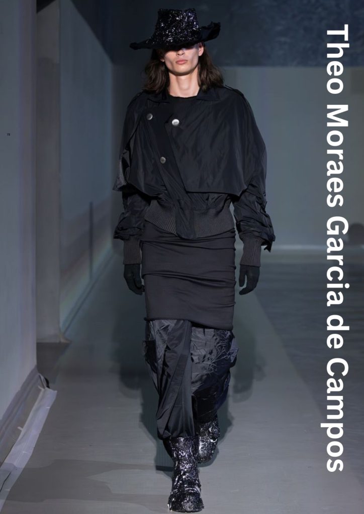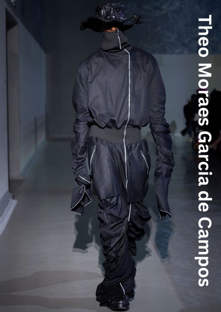 The zeitgeist collection, As the Solid Meets the Fluid, designed by Theo Moraes Garcia de Campos, addresses fabric waste by transforming it into an upcycling fashion statement. Inspired by the rough texture of rocks and the delicate movement of water, this new designer repurposes fabric scraps from London garment manufacturers and dead stock into oversized designs to exaggerate proportions. In Theo Moraes Garcia de Campos’s graduate collection, flowy draped trousers in lightweight fabrics contrast with a bold bomber and dark cape featuring crunched pleated fabric manipulations, raw edges, and heavyweight fabrics styled with a Brazilian fisherman hat.