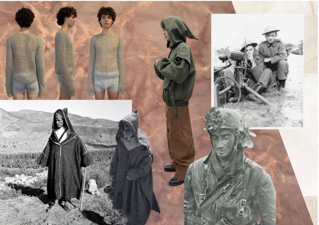 The collection navigates the tension between two distinct sartorial worlds: the rigid structure of the military uniform and the fluid, organic forms of traditional Algerian garments. Dattilo synthesizes these influences through a rigorous material-first approach: