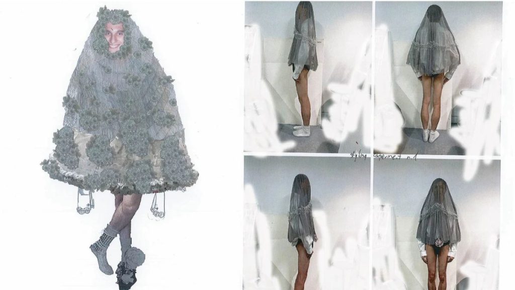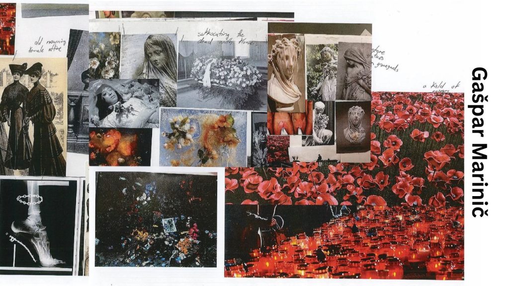 The pages of Gašpar’s sketchbook are a haunting dialogue between the 19th and 21st centuries. Here, the heavy drapes of Victorian widowhood meet the sharp, unapologetic silhouettes of modern queer identity. Initial sketches don't just focus on form; they are annotated with a "secret language" of flora: