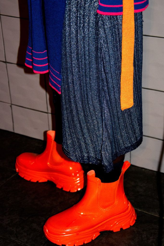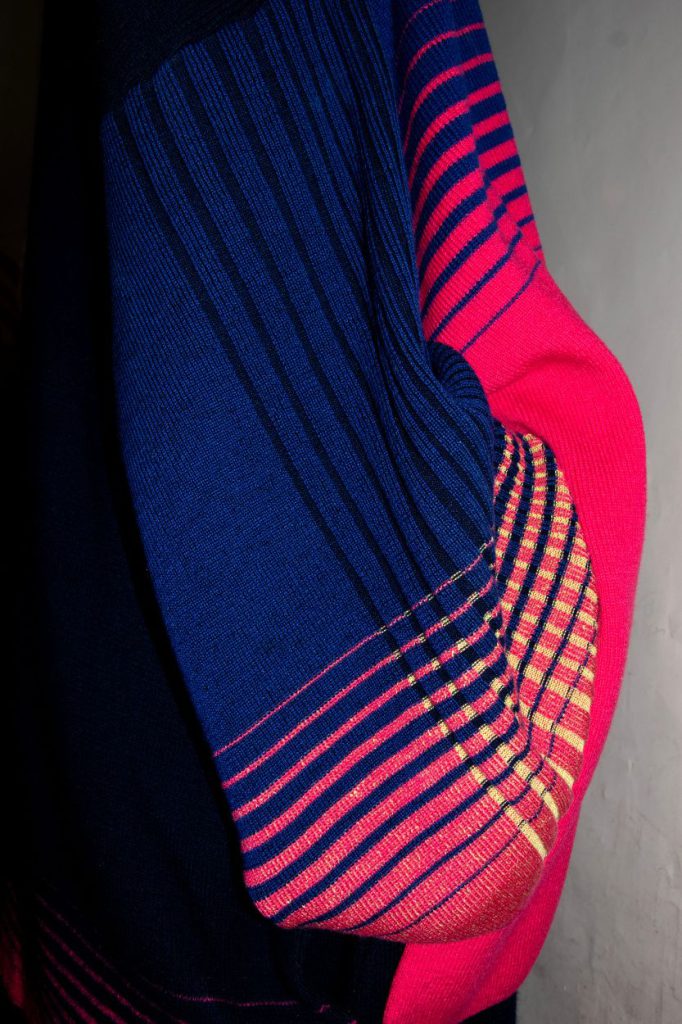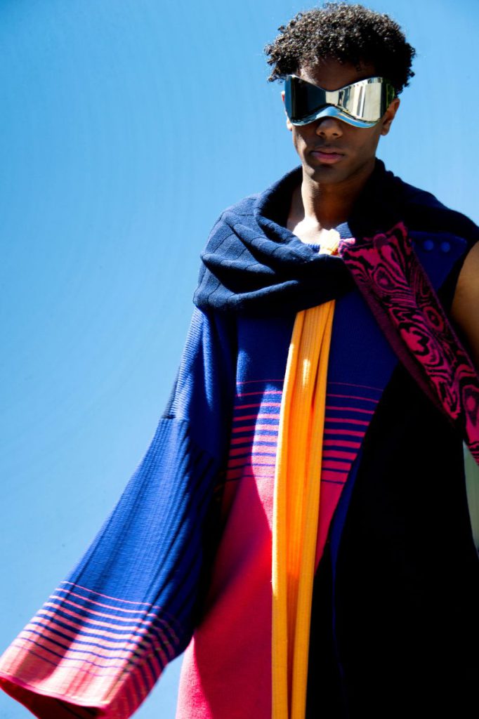 George’s forward-looking approach is grounded by a distinct design identity: bold, clean, and defined by asymmetrical qualities. These traits are evident throughout Metallic Androids, which merges tactile knit structures with sleek, reflective surfaces.