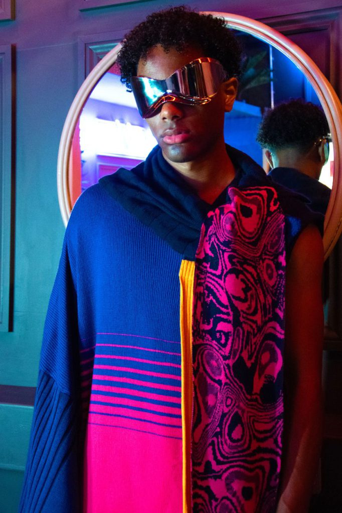 Choosing knitwear was a deliberate path. After his foundation year, George knew it would be his focus. “Every single row, you have full freedom of control,” he says. “It’s like my baby—my heart’s all into it.” This hands-on intimacy meets bold, conceptual styling in a campaign staged among neon lights and mirrored spheres, grounding the collection's cinematic roots.