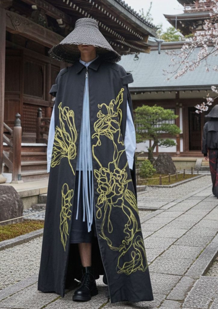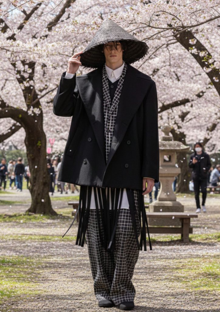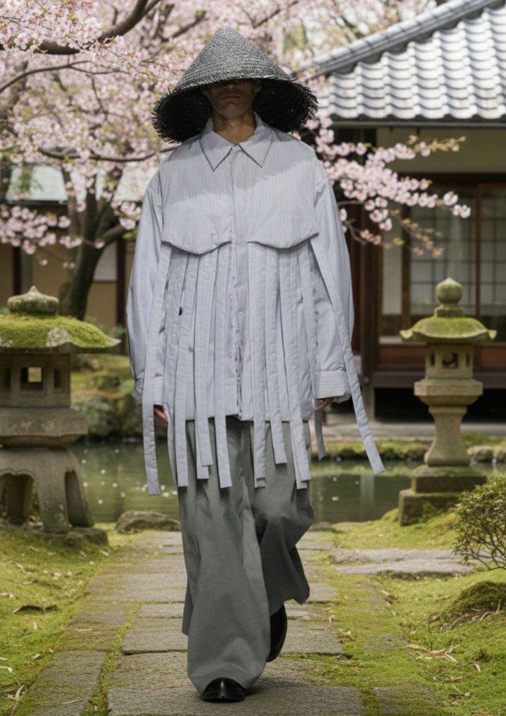 With his collection Yozo, Jacopo presents a fragmented confession where fragility becomes quiet resistance. The collection explores the "social mask"—the performance of humanity we put on to hide our inner turmoil. By blending Edo-period silhouettes with yokai folklore, Cocci creates a tension between the rigid structures of the past and the supernatural "monsters" of the subconscious.