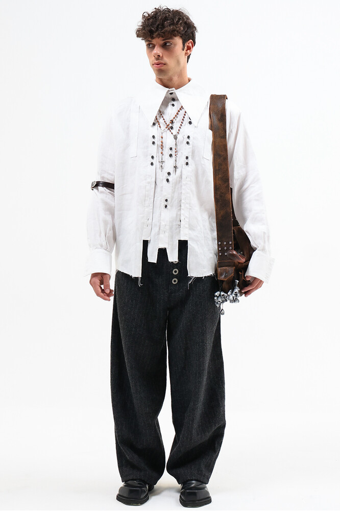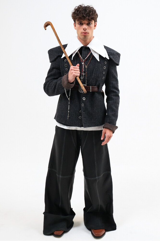 The materiality of the collection is where Salvatore’s message truly takes shape. Utilizing upcycled and salvaged textiles, the designer creates a physical metaphor for rebuilding. Heavy draping and structured layers evoke a sense of protection, while weathered textures and earthy tones reflect the rugged landscape of Southern Italy. The result is a series of looks that feel unearthed rather than manufactured garments that carry the weight of history while maintaining the sharp, underground edge of contemporary streetwear.