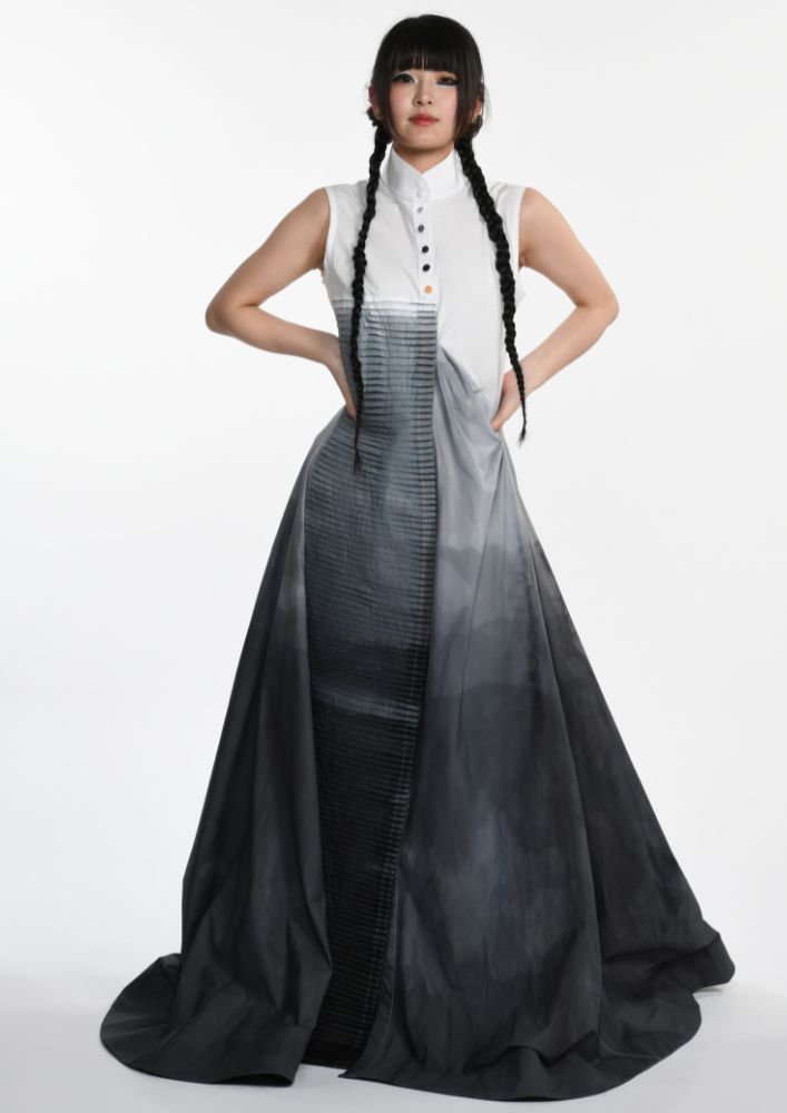 One of the most striking elements of her research is the translation of the traditional horsehair wig into textile design. Muldowney was drawn to the specific texture and form of these cascading curls, which she reinterpreted through intricate pin-tuck detailing and layered fabric treatments. To balance this strict formality, she introduced softer, more abstract visual languages. The organic, futuristic curves of Zaha Hadid’s architecture and the expressive, layered gestures of artist Beñat Olaberria provided a necessary counterpoint, leading to a collection defined by asymmetry, deconstruction, and a sense of movement.