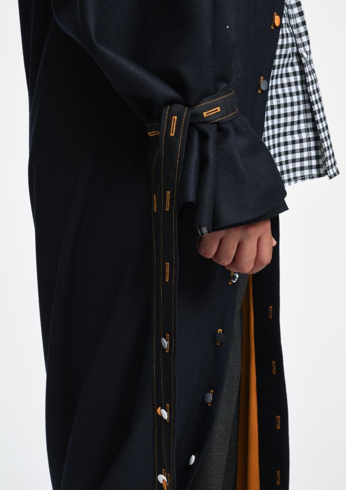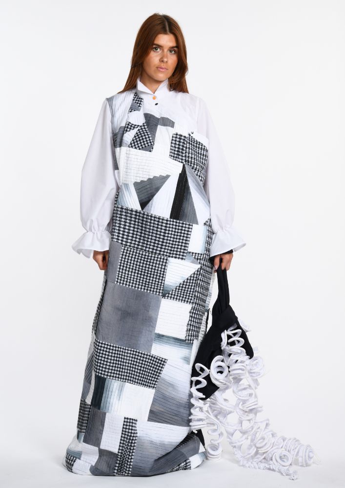 Ultimately, the collection celebrates a unique duality: the sharp, tailored structures of legal tradition are softened by fluid lines and sculptural, deconstructed elements. The silhouettes are intentionally fresh and organic, challenging conventional ideas of symmetry and rigidity. Through a restrained color palette and high-quality natural fabrics, Sarah Muldowney has created a versatile and elegant body of work that proves fashion can be both deeply personal and universally accessible.
