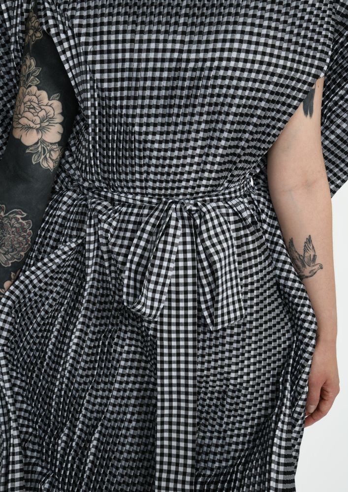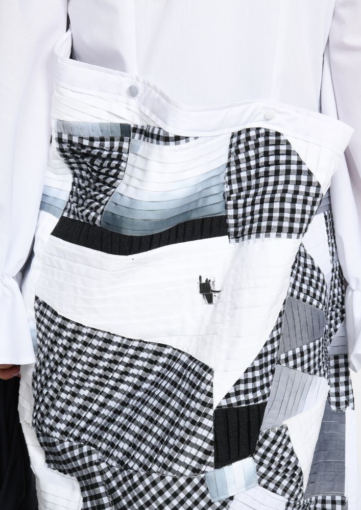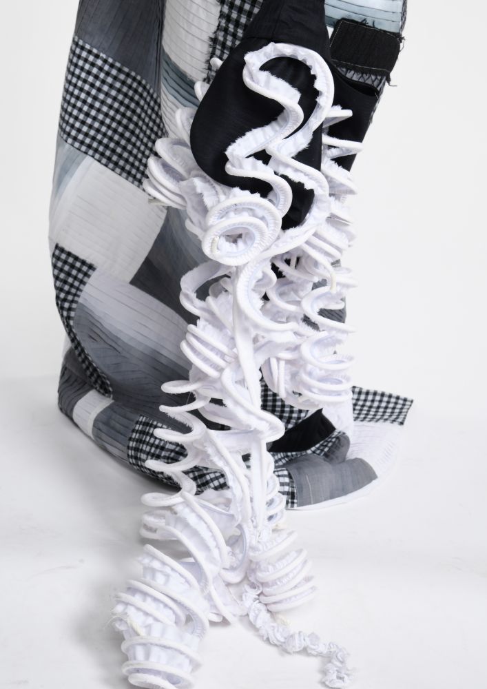 The collection finds its roots in the personal and the professional, drawing heavy inspiration from the elegance and rituals of the legal world. As the daughter of a barrister, Muldowney utilized her early recollections of monochromatic dress codes, archival photographs, and courtroom illustrations to inform her design development. The structured silhouettes and symbolic gravity of professional court dress served as a foundation for her exploration of fabric manipulation, where the rigid formality of the law is translated into wearable art.
