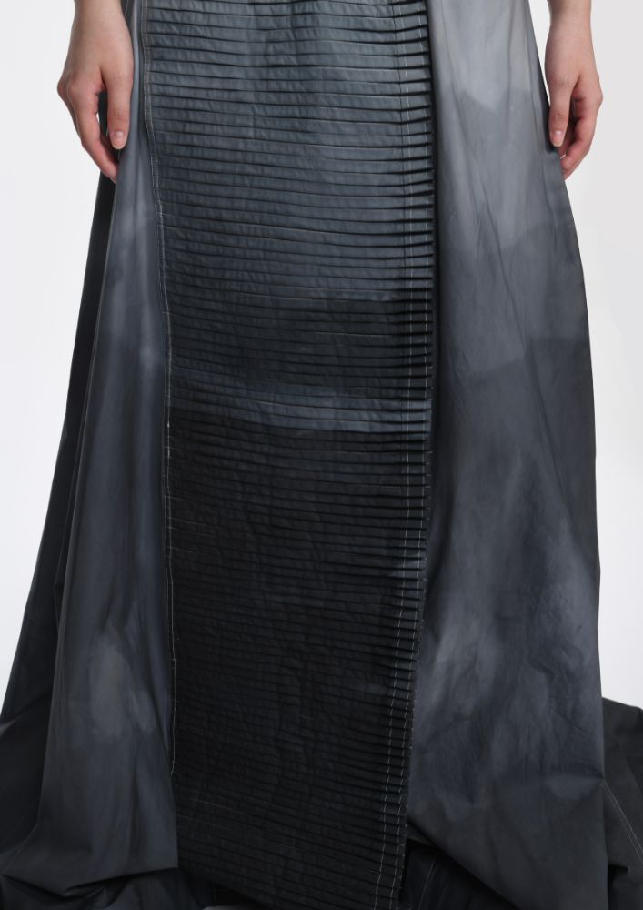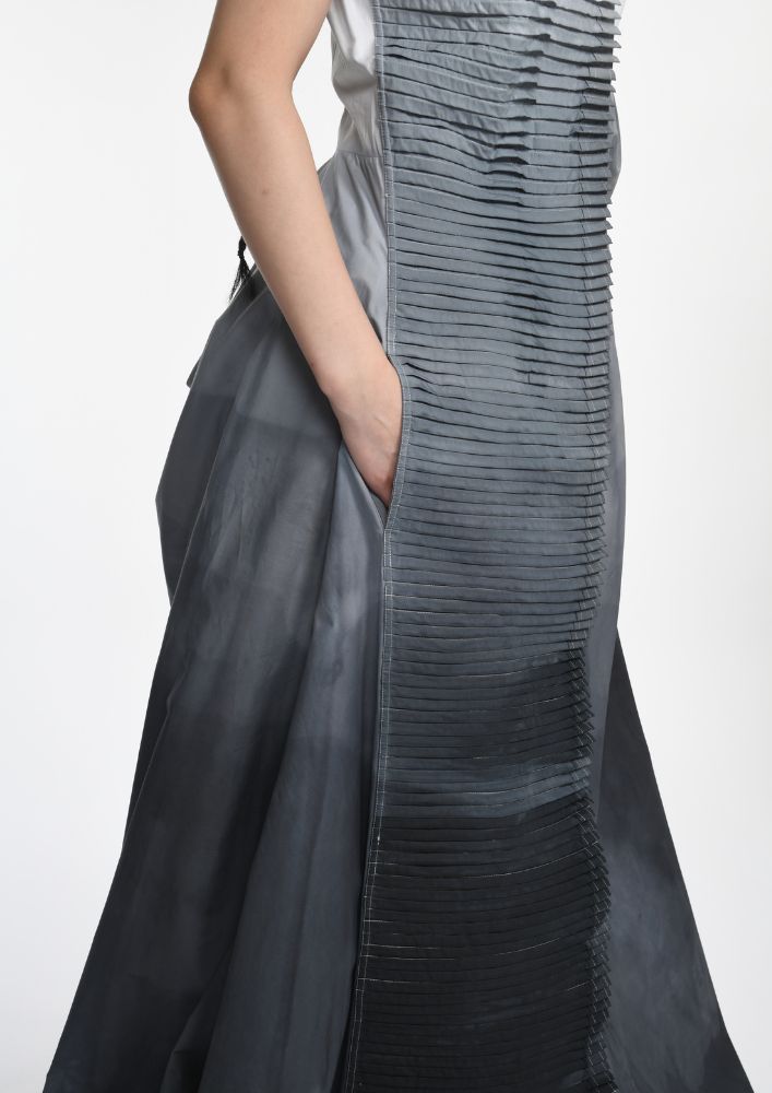 Muldowney’s technical approach was further refined by studying contemporary masters like Peter Do and Phoebe English. Their influence is evident in her thoughtful selection of materials—including hand-dyed silks, cottons, and organza—which allow for a play of transparency and visual depth. This focus on material quality is paired with a deep commitment to sustainability. Following a zero-waste methodology and the philosophy that “better is greater than more,” Muldowney prioritizes durability and intentionality, ensuring each piece is a timeless addition to a wardrobe rather than a fleeting trend.